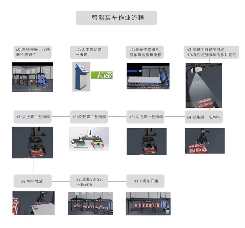 用自动化设备替代人工实现自动装车,此设备的导入能够节省人力提高生产效率及降低劳动强度。项目方案以桁架机器人、3D视觉传感器和激光传感器为主体,通过自动装车系统把各个作业工序连接起来,很好实现了本项目的所有功能要求。