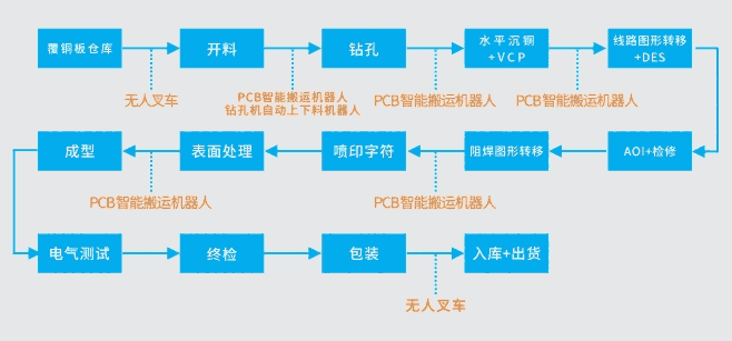 蓝芯科技PCB行业智能物流解决方案可通过PCB智能搬运机器人、无人叉车、钻孔机自动上下料机器人等自动搬运和上下料设备把PCB车间的各个加工工序连接起来,通过系统控制实现全自动化加工,减少人为干预,进一步提高生产效率及生产的智能化、自动化、数字化。
