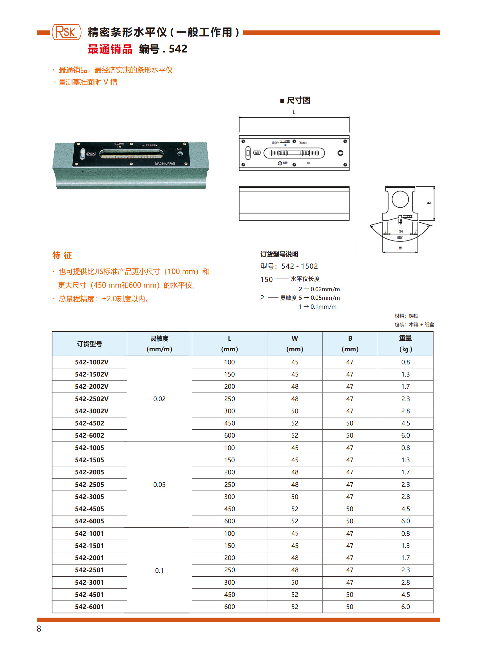 542-2002AA日本RSK理研水平尺符合日本JIS标准