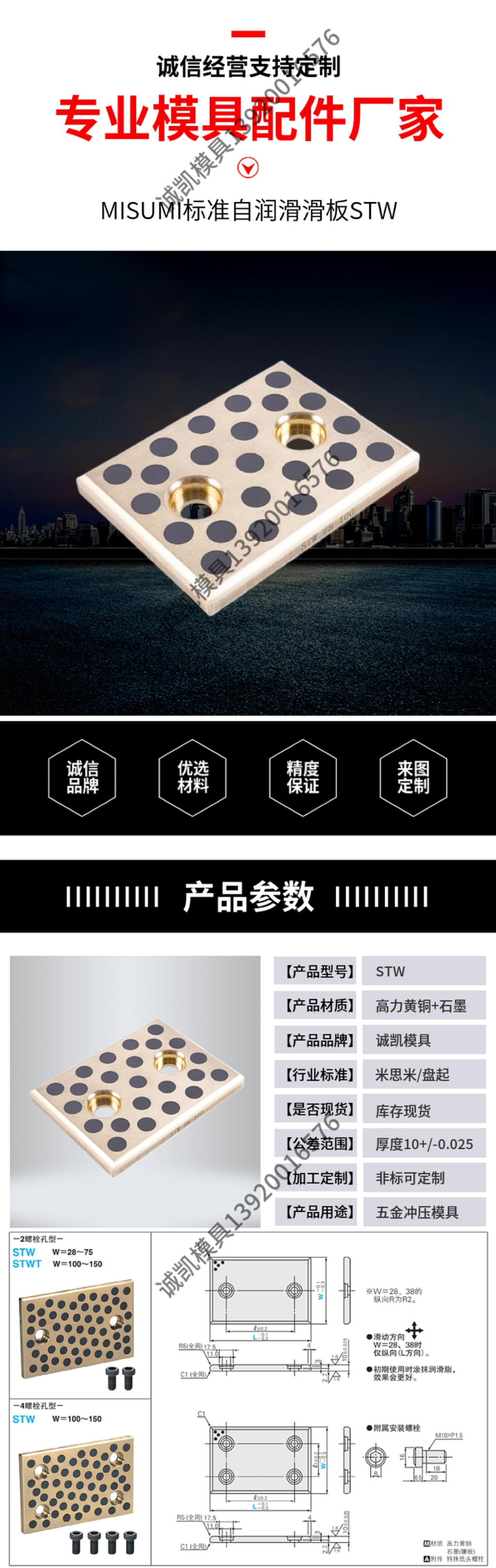 模具标准件自润滑滑板导板STW高力黄铜镶嵌石墨