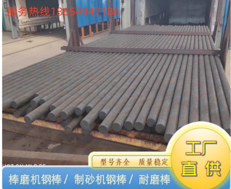 ??我公司生产耐磨钢棒的原材料均是来自于国内的大型钢厂,主要材质有:65Mn,60Mn,45号钢,40Cr,B2等十几种材料。生产工艺为:钢厂原材料中频炉加热---调直---淬火---高温回火---7m高跌落试验---合格出库
