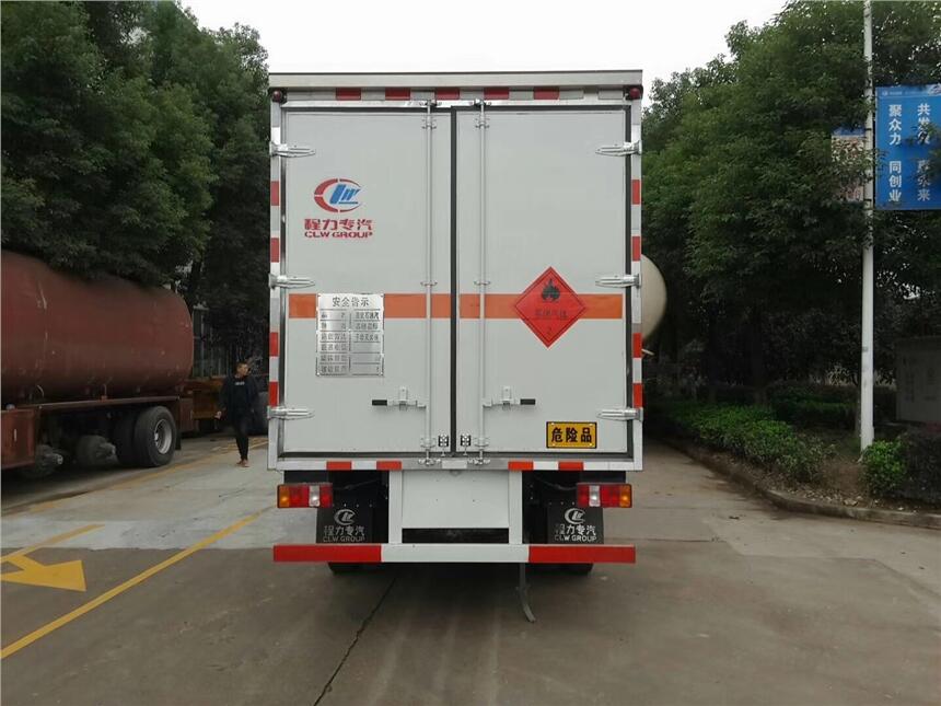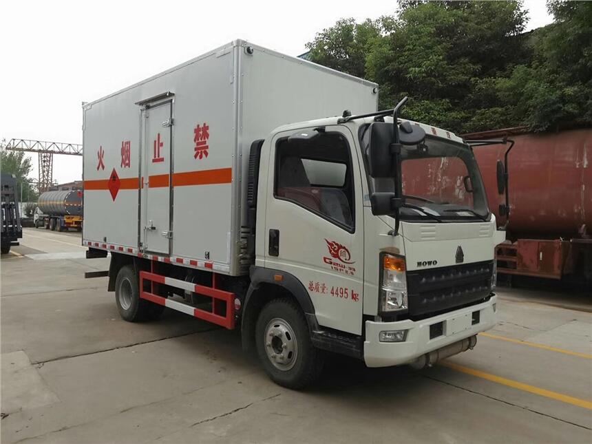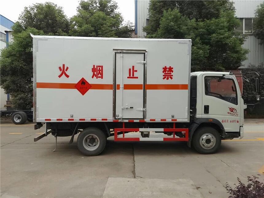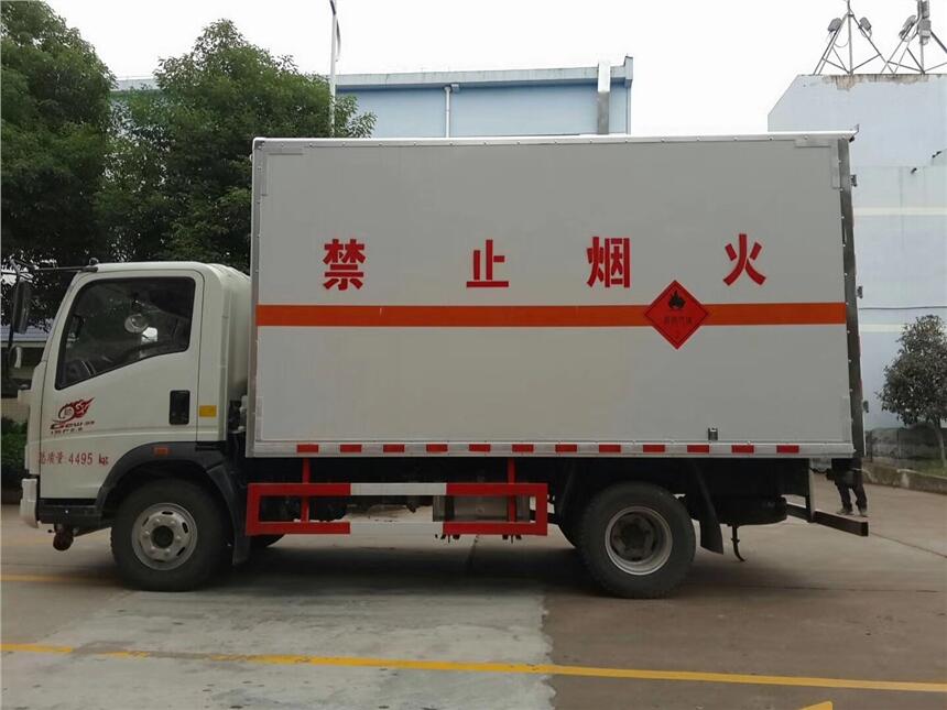 重汽豪沃易燃气体厢式运输车:配备重汽原厂豪沃危险品专用底盘,康明斯148马力发动机,6档变速箱,7.50钢丝轮胎,带空调,电动车窗,前盘制动,ABS,限速器,排气管前置带防火帽。
