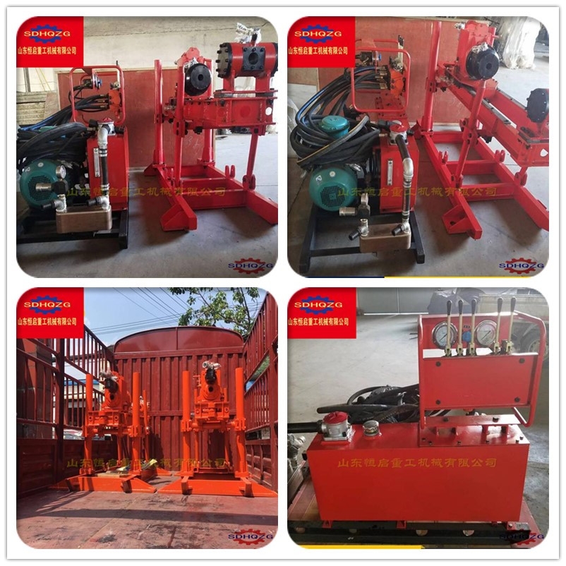 3、钻机由液压泵站、动力头、机架、操作台、立柱支承等部件组成,工作时用高压油管联接,远离井口操作,安全。