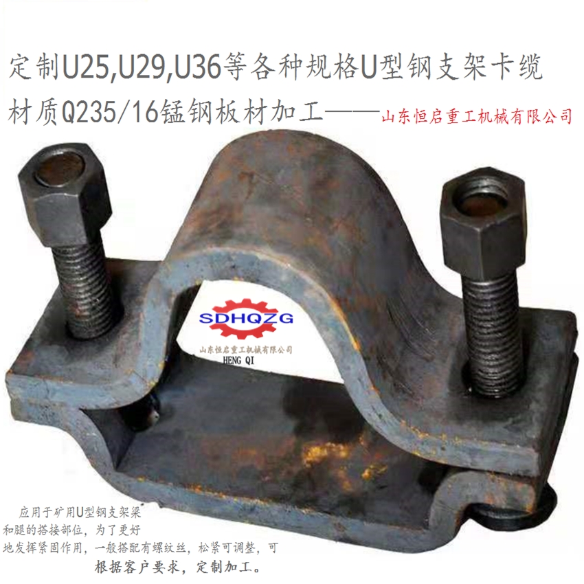 U型钢支架卡缆,有单卡卡缆、双卡卡缆、上限位卡缆、下限位卡缆。主要应用于矿用U型钢支架梁和腿的搭接部位,为了更好地发挥紧固作用,一般搭配有螺纹丝,松紧可调整,可根据客户要求,定制加工。