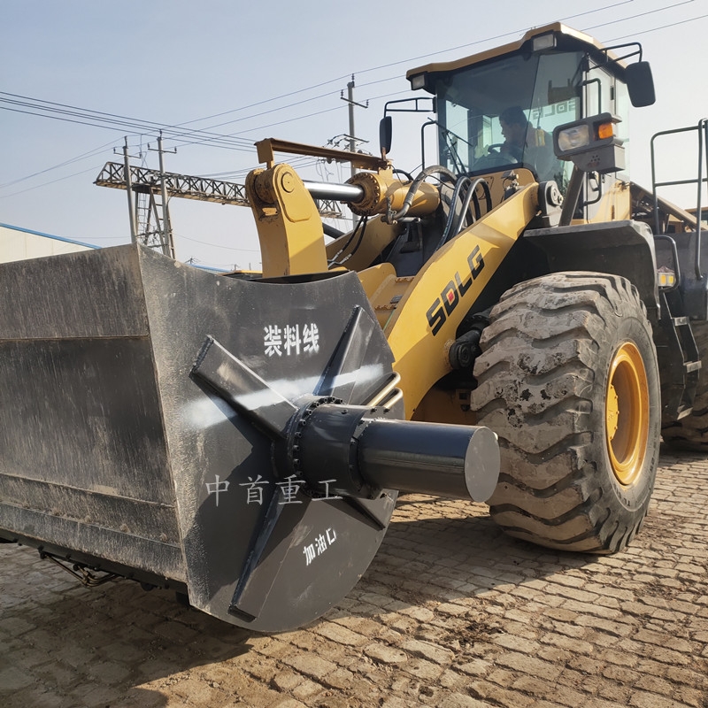 中首重工搅拌铲斗装载机是利用一台装载机把铲斗部位拆除,安装上铲斗式搅拌缸及其配套系统就是一台装载机铲斗式混凝土搅拌机,实现自行上料、拌合、 转场、卸料功能。。 搅拌斗内安装有耐磨衬板,如有损坏,可以更换,方便快捷。。 装载机搅拌斗搅拌启动液压马达控制阀,使低速大扭矩液压马达带动搅拌叶片对搅拌缸内的混凝土物料进行搅拌,完成搅拌工作。。