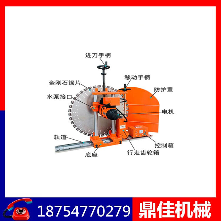 · 此款设备操作简单,用膨胀螺丝固定好轨道,机器放轨道上(轨道上有锯齿,机器上有齿轮不会滑落,只能用手轮操作移动),装好锯片,防护罩,通水通电后就两手轮操作,中间手轮控制锯片上下刀,右边手轮控制机器在轨道上移动。