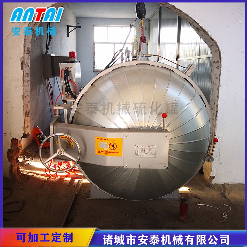 电加热硫化罐是一种新型的硫化方式。温度、压力、时间采用自动控制,性能稳定可靠,使用方便,安全环保无污染,比传统硫化罐节能百分之三十以上。电热管采用新型的导热。欢迎新老客户前来安泰机械公司购买硫化罐绝缘氧化材料,加热快效率高,使用寿命长。电热管分N组开关单独控制,达到工作温度后只保留其中1-2组保温工作,极大的节约用电能耗减少使用成本。罐内温度均匀无死角,压力恒定无误差,解决了因温度和压力不均匀造成的产品质量不同问题。设定工作程序后,控制系统自动进行升温、保温、硫化等工作,硫化结束后发出声光音并自