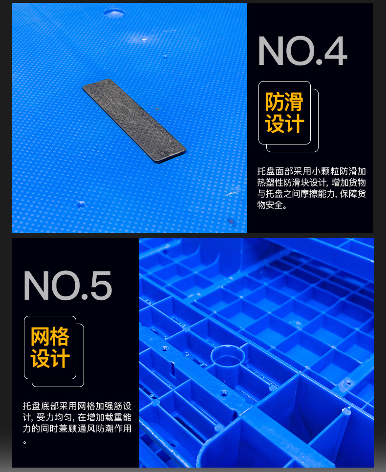圆角防撞设计,产品采用四角圆弧防撞,大大增加托盘对外力冲击的抵抗能力,在保护托盘不受损坏的同时也保证了使用者的安全。防滑功能设计,产品表面、底部、货叉面均设有热塑性聚氨酯弹性体双层结构的PP防滑垫,大大增加托盘与货物之间的摩擦性能防止货物在移动过程中滑落,提高使用安全性。内置钢管设计,可根据客户需求加装7-10根镀锌钢管以增加产品的载重能力,整体更抗压、更耐用、更不易损坏,在立体库上货架使用中托盘必须加钢管。RFID芯片槽设计,部分产品带有RFID芯片槽方便客户安装电子标签,在货物信息管理中起到良好的辅助性。