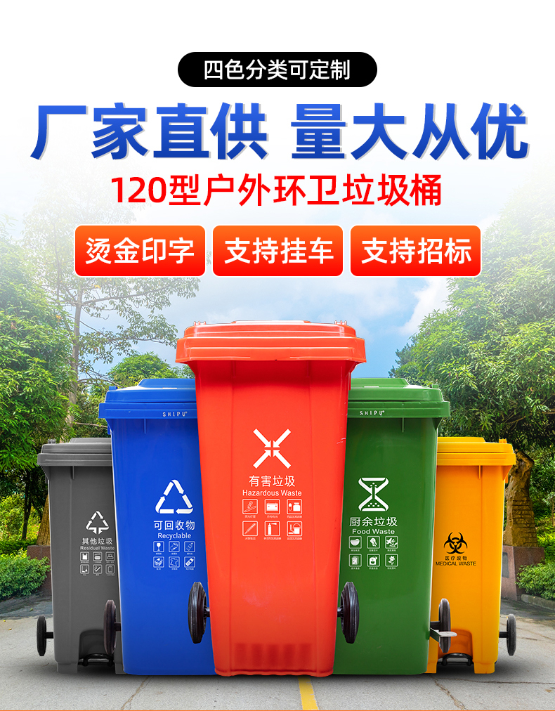 本公司生产的垃圾桶,种类丰富多样,颜色各异。我们的垃圾桶也是符合垃圾分类标识,蓝色垃圾桶为可回收物,红色垃圾桶为有害垃圾,绿色为餐厨垃圾,灰色为其它垃圾。垃圾桶颜色各异,使用者可按照自己随意使用。