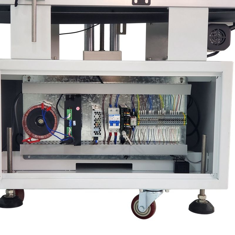 ·可以通过拧动螺旋把手来控制定位轮的移动,从而固定纸箱,让封口更加整齐和牢固。