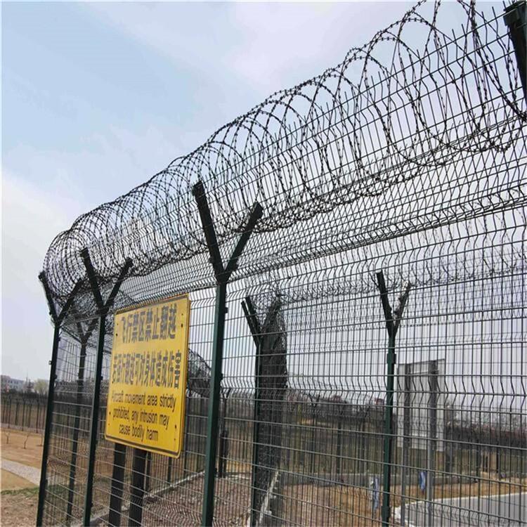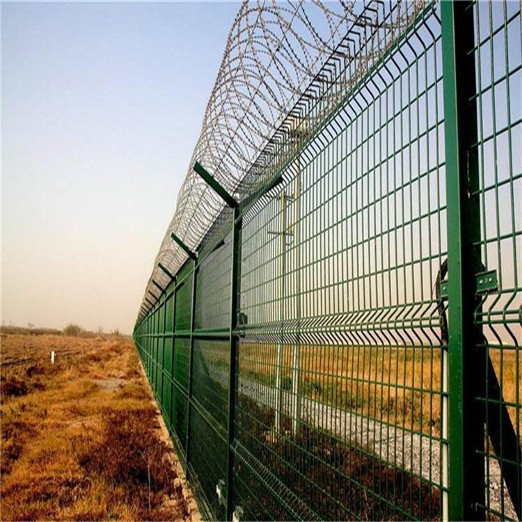 机场防护隔离网是由折弯网片 V型支架立柱加强型焊接片网,上面有刀片刺绳安全防盗连接件组成强度和安全防御性级别很高的一种产品,因为又被称为机场钢筋围界、Y型金属网格围栏。机场防护网表面防腐处理采用电镀、热镀、喷塑、浸塑等形式,具有很好的抗老化、抗晒、耐腐蚀等特点。