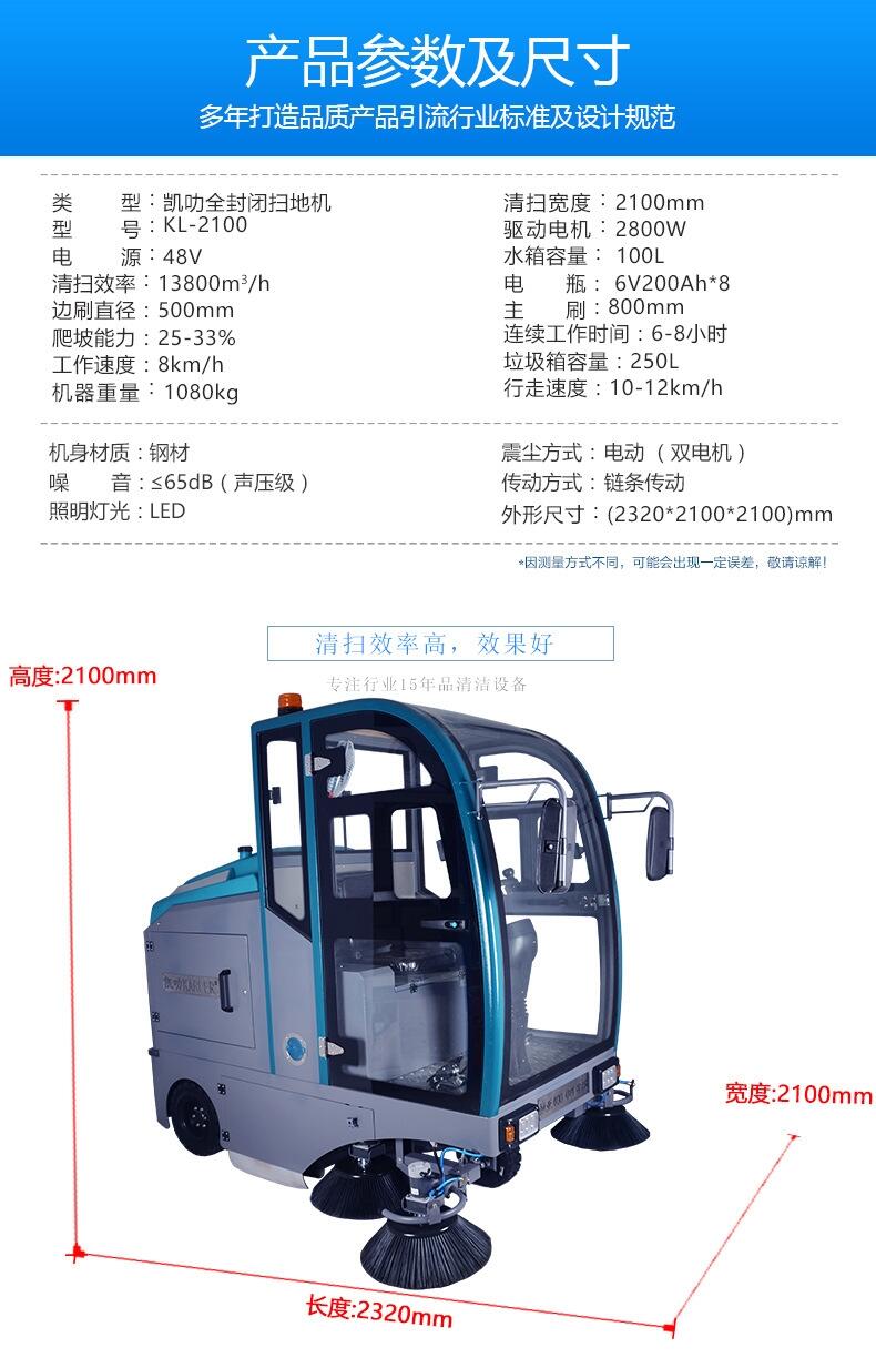 K2100型全封闭驾驶式扫地机是扫地、喷水、吸尘相结合的自动全封闭驾驶式清洁能源综合机器。