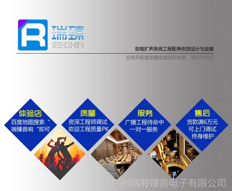 广州瑞聆臻音电子有限公司是专业的ktv音响、家庭影院、舞台音响、影k、线阵、公共广播系统、紧急消防广播系统生产厂家。广泛应用于校园广播、大型超市、高档小区、别墅、居家生活、公园、工厂、火车站、汽车站、地铁、机场、ktv、旅游景点等行业。