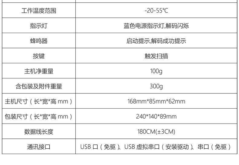高速二维码扫描枪,轻松识别高密度长条码、PDF417二维码,手机支付,即插即用,方便快捷;包教包会,7*12小时原厂专业技术支持,快速迭代;支持在线升级,版本迭代;宽电压设计,解决不稳定的行业难题;适用多种扫码类型,广泛应用于超市、便利店、商场百货、零售店、餐饮等;扫码收银,快速识读,精准识别商品条码,凹凸反光条码,彩色覆膜条码,低亮度屏幕,电子打印标签码;自感应扫描,解放双手,只需将条码靠近扫描枪,便可自动唤醒读取,无需进行按键扫描,节能省时;支持扫描中文二维码,输出中文信息,广泛适用于医药、物流等行业;高密度一维长条码轻松识别,解决行业难题,快速识别货物流通单,长达50位一维条码,电子高密度一维码;条码速度灵敏精确,扫码速度达到2.6m/秒,扫码快人一步;兼容多种操作系统,兼容收银软件和进销存软件;影像白光补光无惧黑夜,大角度远距识别,宽电压设计,拒绝卡顿。