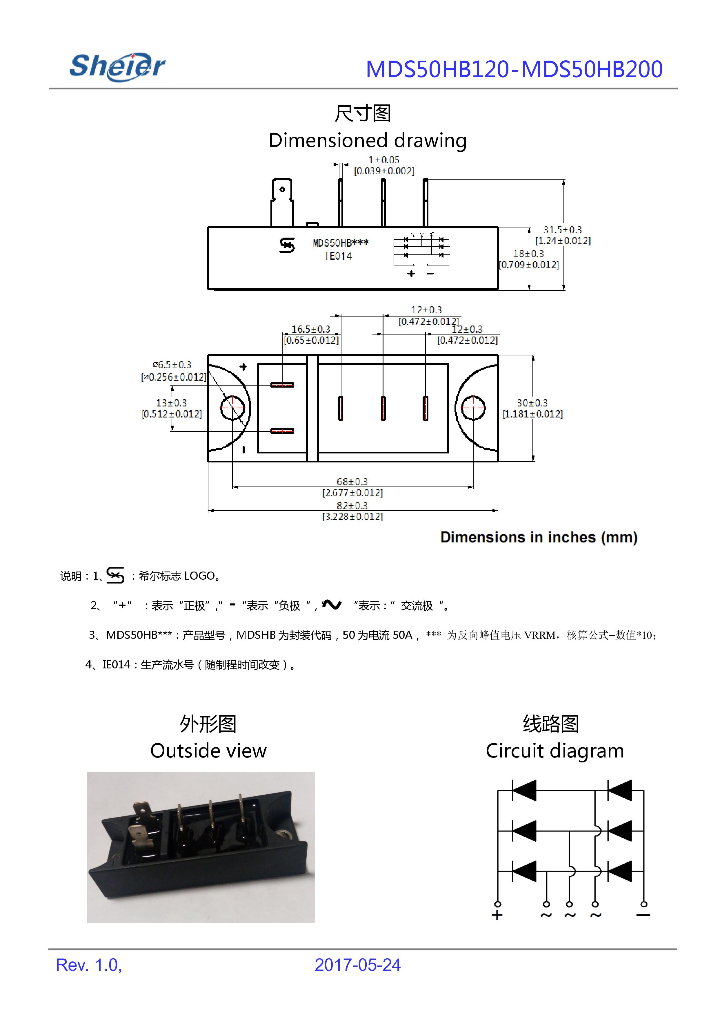 “页面标价非成交价,请联系详询报价”? ?sheier/希尔 全新原厂原装大功率三相整流桥模块:MDS50HB160;正向电流:50A;反向峰值电压:1600V;正向压降:1.1V;浪涌电流:750A;绝缘电压:2500V;尺寸体积:82*30*31cm;封装方式:大模块。