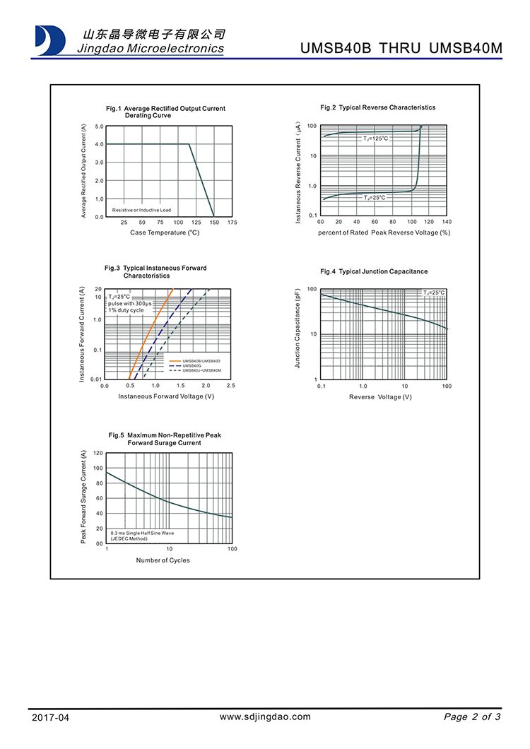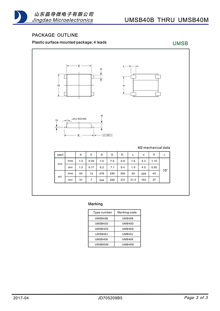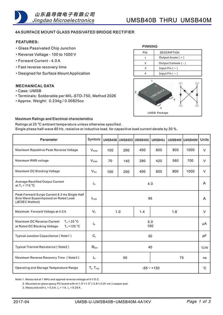 ? ? ? ? JINGDAO/晶导微 原厂原装全新正品贴片75ns高效快恢复整流桥堆:UMSB40M、UMSB40K、UMSB40J、UMSB40G;反向恢复时间:75ns;最大正向平均整流电流IF:4A;最大正向峰值抗浪涌电流IFSM:95A;最大反向峰值电压VRRM:1200V~200V;正向管压降VF:1.3V;反向漏电流IR:5ua;工作储存芯片结温:-55℃~150℃;安装封装方式:MSB-4 :?6.9*8.8*1.5mm。