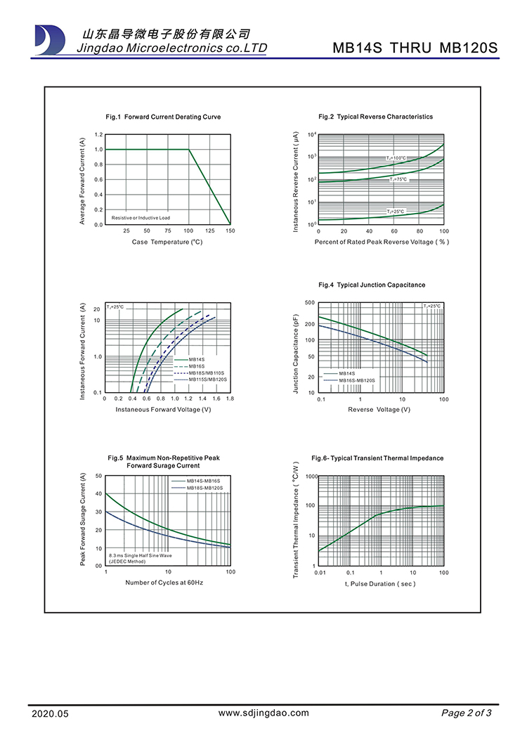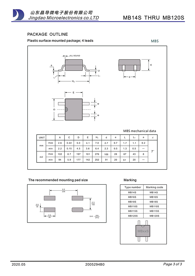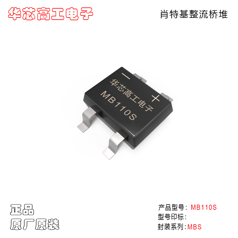 JINGDAO/晶导微 原厂原装全新正品贴片中低压超高频肖特基整流桥堆:MB120S、MB115S、MB110S、MB18S、MB16S、MB14S;反向恢复时间:5ns;最大正向平均整流电流IF:1A;最大正向峰值抗浪涌电流IFSM:30A~40A;最大反向峰值电压VRRM:200V~40V;正向管压降VF:0.55V~0.95V;反向漏电流IR:300ua;工作储存芯片结温:-55℃~150℃;安装封装方式:MBS-4 : 4.9*7.0*2.6mm。