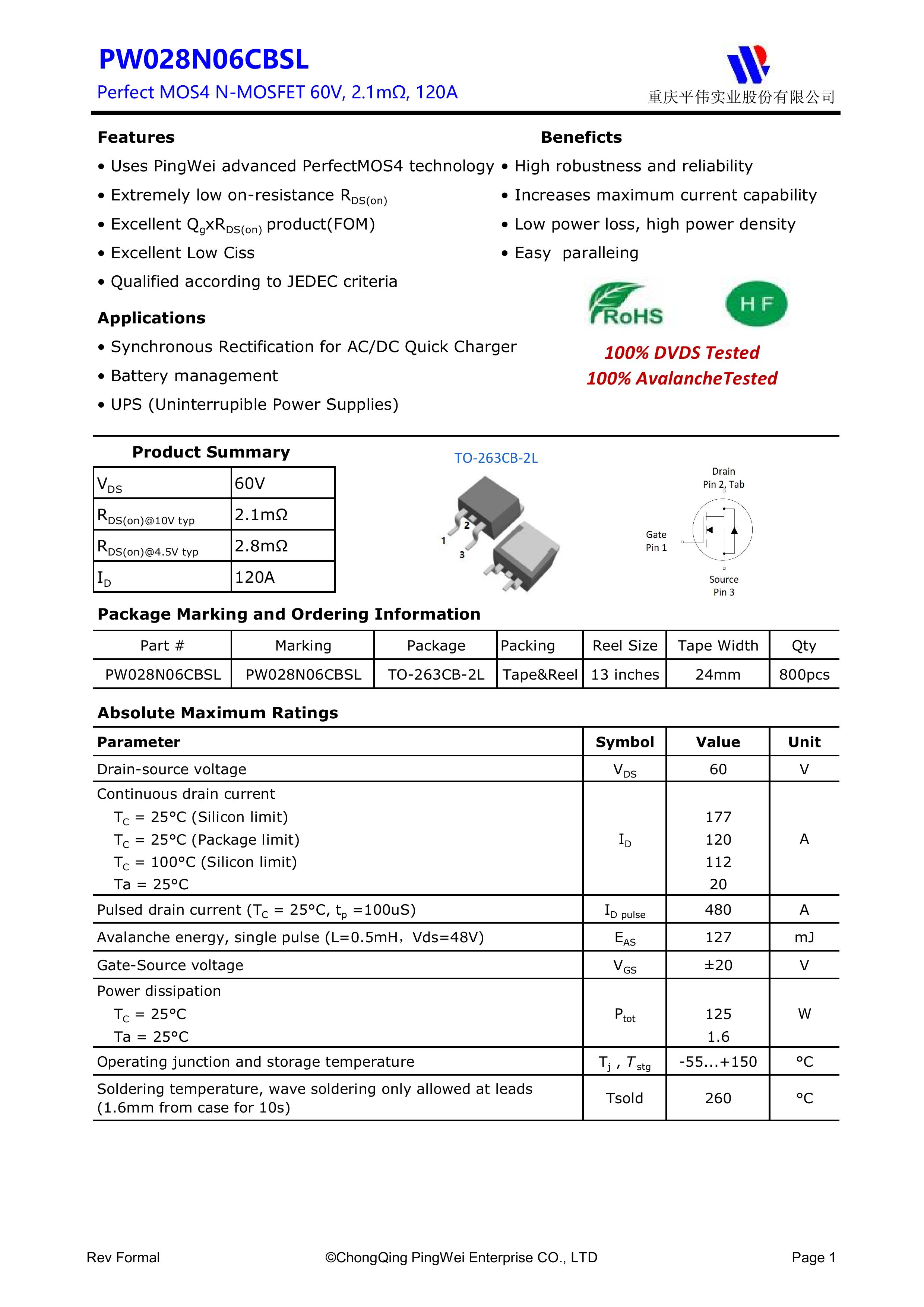 "页面标价非成交价,请联系详询报价” PY/重庆平伟实业 全新原厂原装高频中低压功率控制开关管N型沟道场效应管,640V,177A,2.1mΩ,N-Channel,贴片式中低压MOSFET:PW028N06CBSL;电压Vds:60V;电流Id:177A;内阻Rds(on):2.1mΩ;封装方式:TO-263-2L;最小包装数量:800pcs/盘-编带。