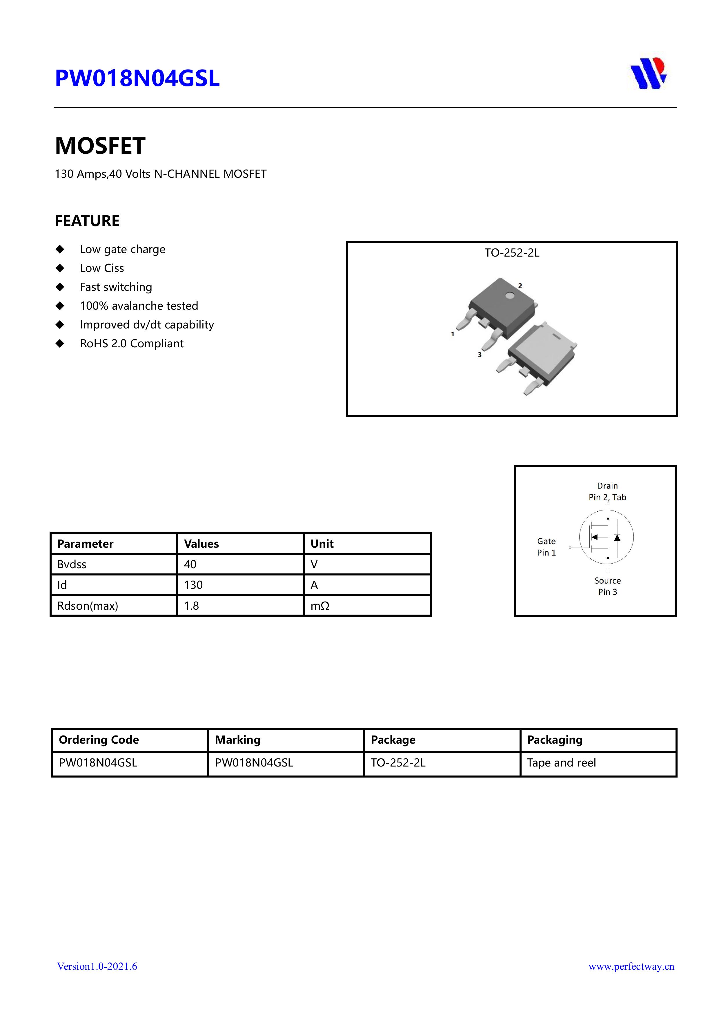 PY/重庆平伟实业 PW018N04GSL 全新原厂原装中低压高频功率控制电子开关管,N型沟道场效应管40V、130A、1.3mΩ、N-Channel、贴片式中低压MOSFET:PW018N04GSL。Vds电压:40V;Id电流:130A;Rds(on)内阻:1.3mΩ;封装方式:TO-252-2L;最小包装数量:2500pcs/盘-编带。