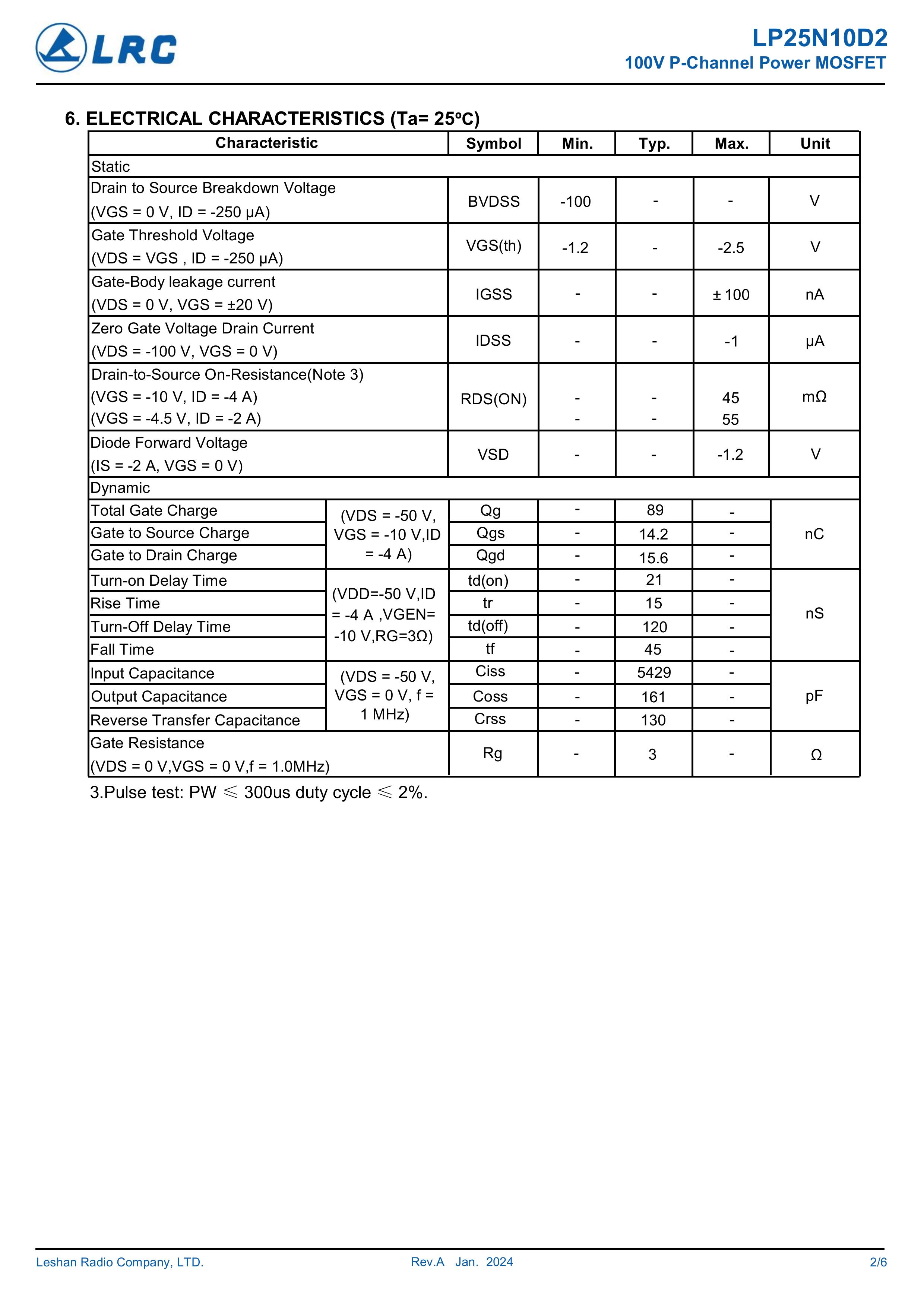 LRC/乐山无线电 LP25N10D2 全新原厂原装中低压高频功率控制电子开关管,P型沟道场效应管-100V、-25A、45mΩ、P-Channel、贴片式中低压MOSFET:LP25N10D2/25N10。Vds电压:-100V;Id电流:-25A;Rds(on)内阻:45mΩ;封装方式:TO-252-2L;最小包装数量:2500pcs/盘-编带。