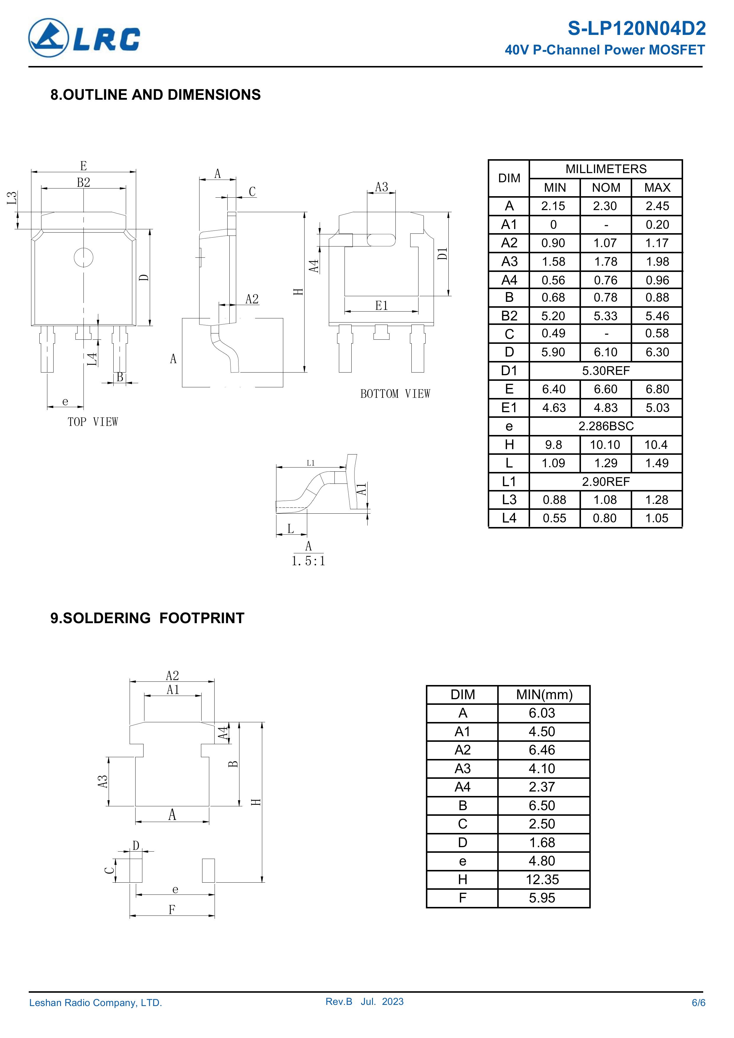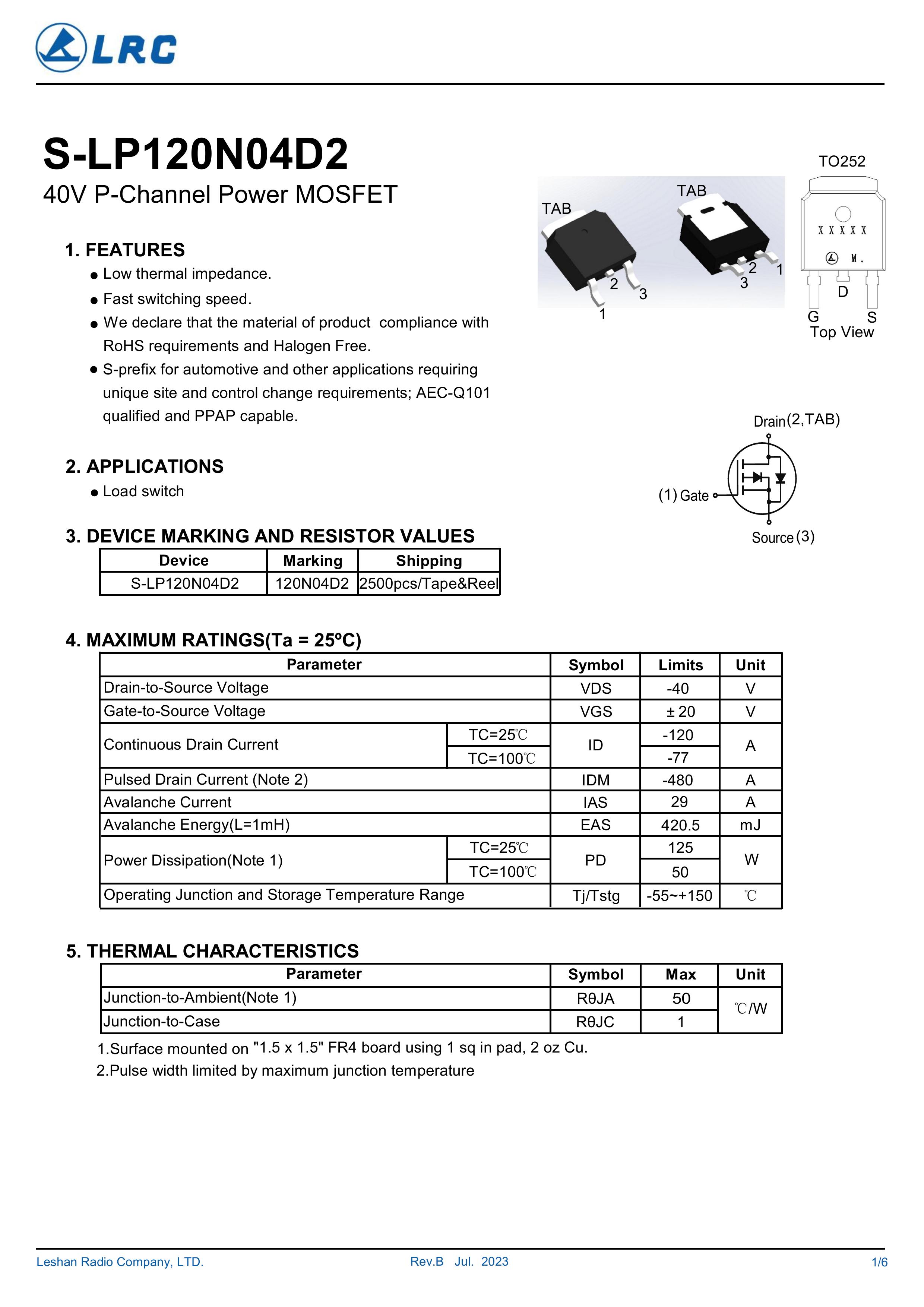 LRC/乐山无线电 S-LP120N04D2 全新原厂原装中低压高频功率控制电子开关管,车规级P型沟道场效应管-40V、-120A、4.2mΩ、P-Channel、贴片式中低压MOSFET:S-LP120N04D2/120N04D2。Vds电压:-40V;Id电流:-120A;Rds(on)内阻:4.2mΩ;封装方式:TO-252-2L;最小包装数量:2500pcs/盘-编带。