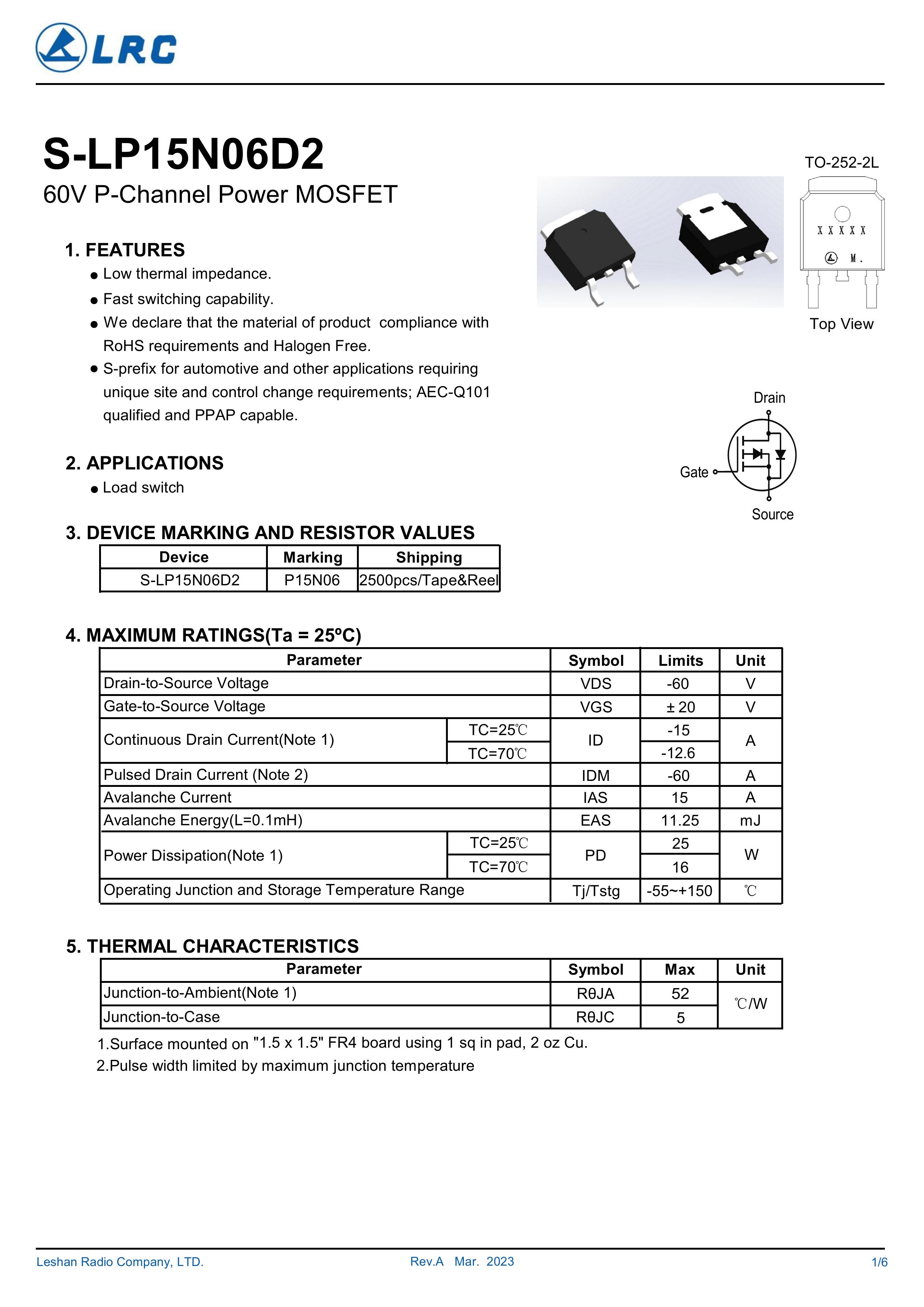 LRC/乐山无线电 S-LP15N06D2 全新原厂原装中低压高频功率控制电子开关管,车规级P型沟道场效应管-60V、-15A、64mΩ、P-Channel、贴片式中低压MOSFET:S-LP15N06D2/P15N06。Vds电压:-60V;Id电流:-15A;Rds(on)内阻:64mΩ;封装方式:TO-252-2L;最小包装数量:2500pcs/盘-编带。
