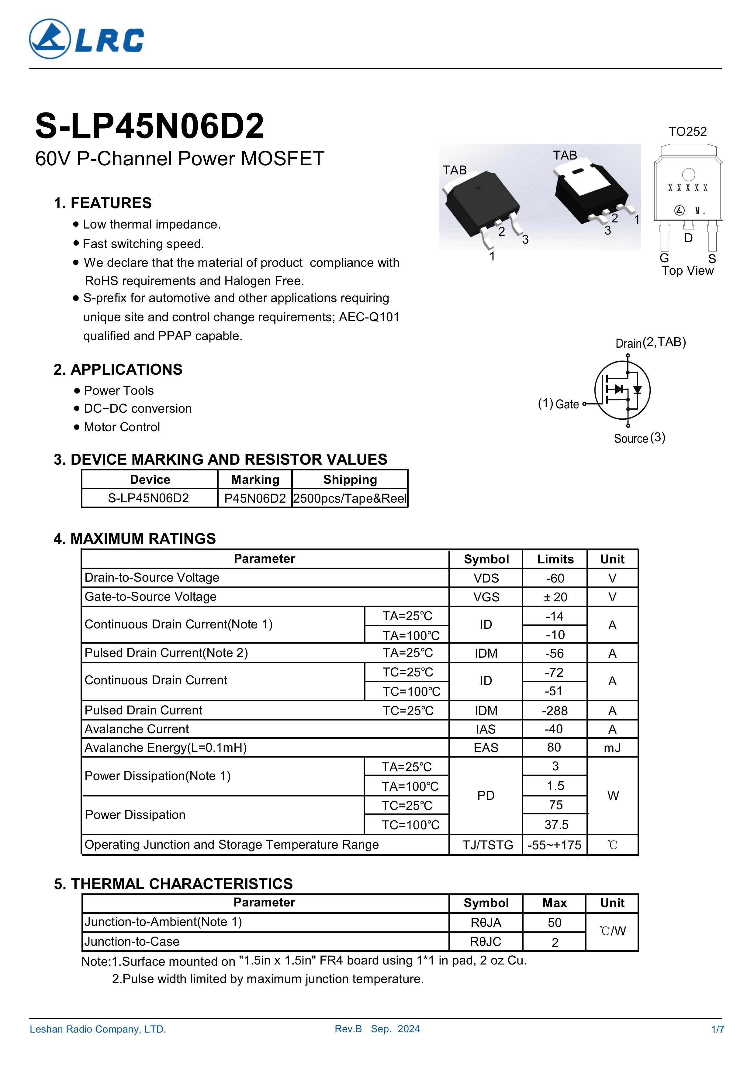 LRC/乐山无线电 S-LP45N06D2 全新原厂原装中低压高频功率控制电子开关管,车规级P型沟道场效应管-60V、-56A、10mΩ、P-Channel、贴片式中低压MOSFET:S-LP45N06D2/P45N06D2。Vds电压:-60V;Id电流:-56A;Rds(on)内阻:10mΩ;封装方式:TO-252-2L;最小包装数量:2500pcs/盘-编带。