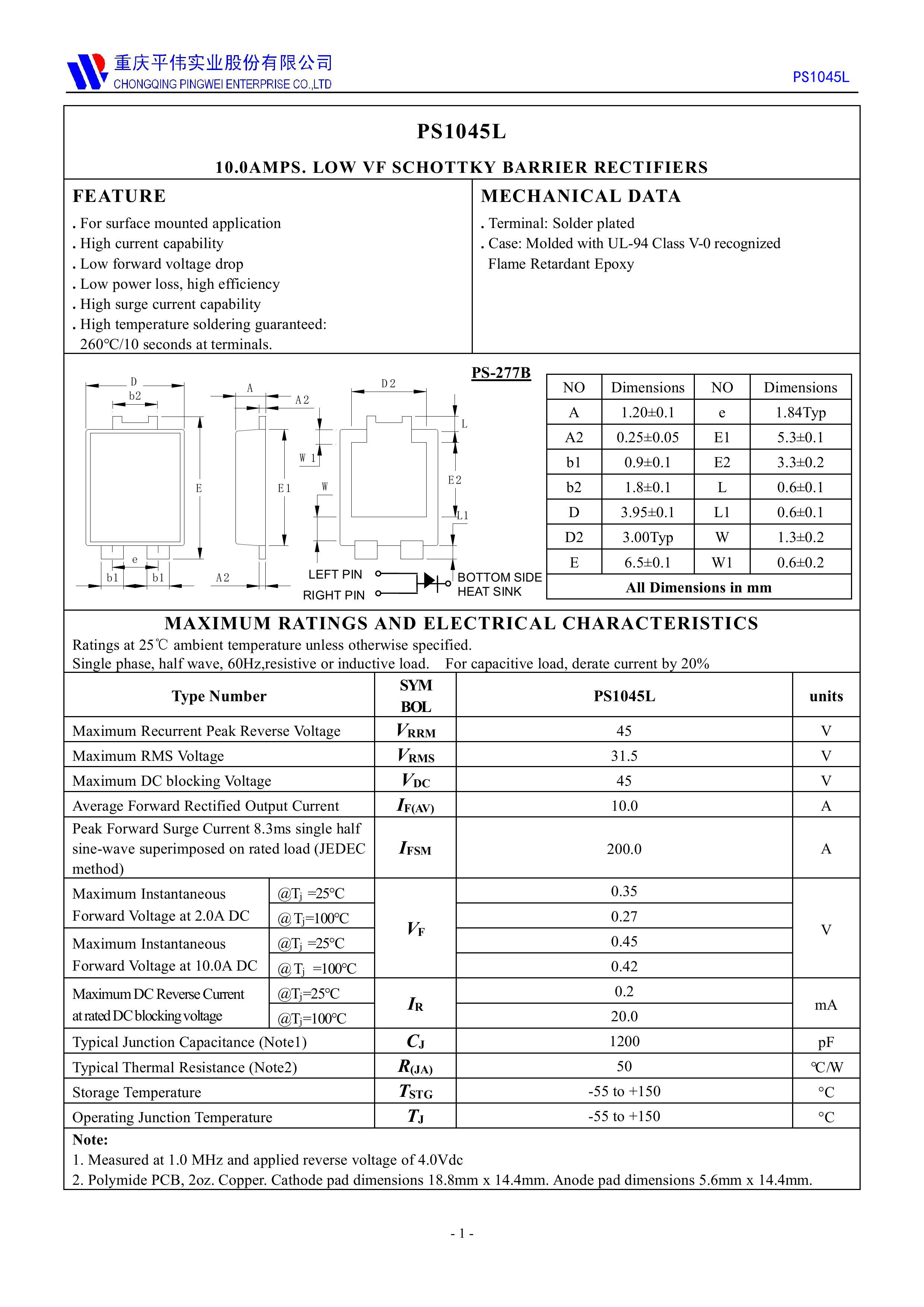 PY/平伟 PS1045L 全新原厂原装高频中低压功率整流管LOW-VF低压降肖特基10A、45V,小体贴片封装低压降肖特基二极管:PS1045L;反向耐电压:45V;正向平均电流:10A;正向压降VF:0.45V;反向恢复时间Trr:5ns;芯片结温:-55℃~150℃;封装方式:TO-277;最小包装数量:3000pcs/盘-编带。