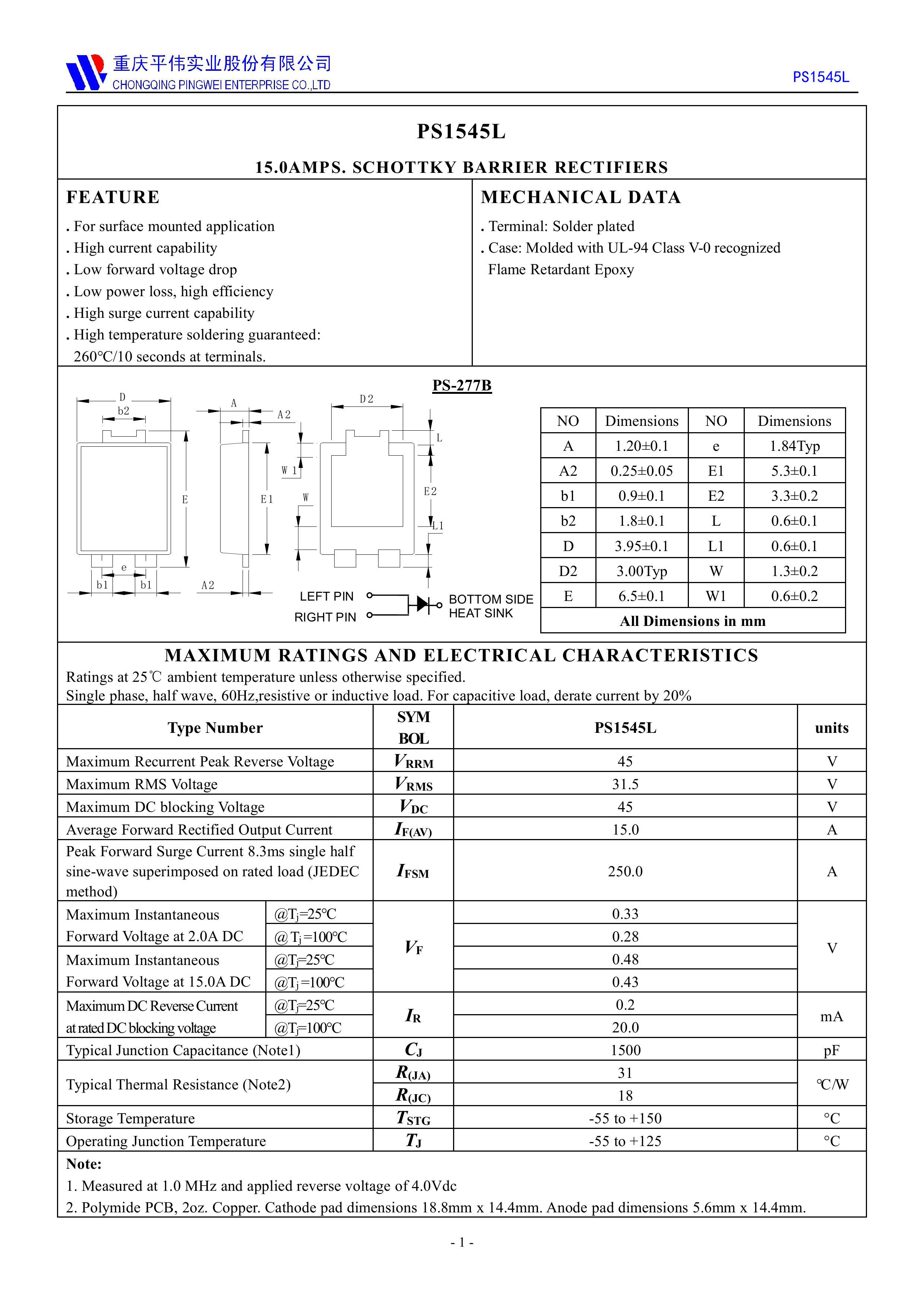 PY/平伟 PS1545L 全新原厂原装高频中低压功率整流管LOW-VF低压降肖特基15A、45V,小体贴片封装低压降肖特基二极管:PS1545L;反向耐电压:45V;正向平均电流:15A;正向压降VF:0.45V;反向恢复时间Trr:5ns;芯片结温:-55℃~150℃;封装方式:TO-277;最小包装数量:3000pcs/盘-编带。