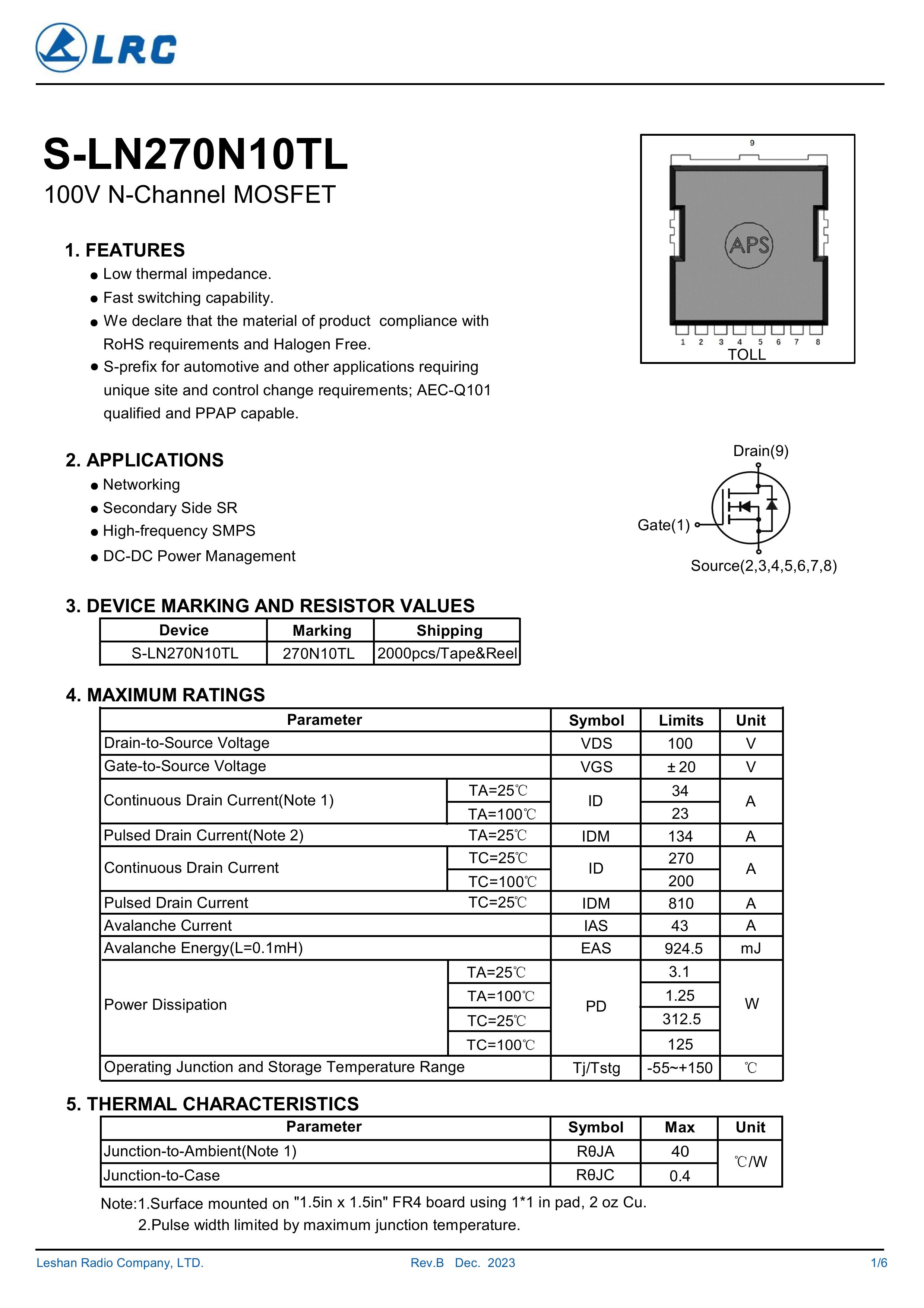 S-LN270N10TL/270N10TL 大芯片中低电压大电流低内阻低漏电的分立式功率整流晶体开关管。本品采用内置大尺寸芯片,源极7脚位支持多路输出贴片式封装,AEC-Q101认证,具有适应中低电压低内阻损耗高频高效恢复快等电气特性特点。通用于电源、小家电、锂电池、马达电机、电动工具、无人机、电器、适配器、充电器、逆变器、充电桩、特种电源、高频电源、风光储新能源、医疗设备、工业工控等产品电路作电子开关、控制、整流、放大、钳位、防反接、防逆回流等作用。