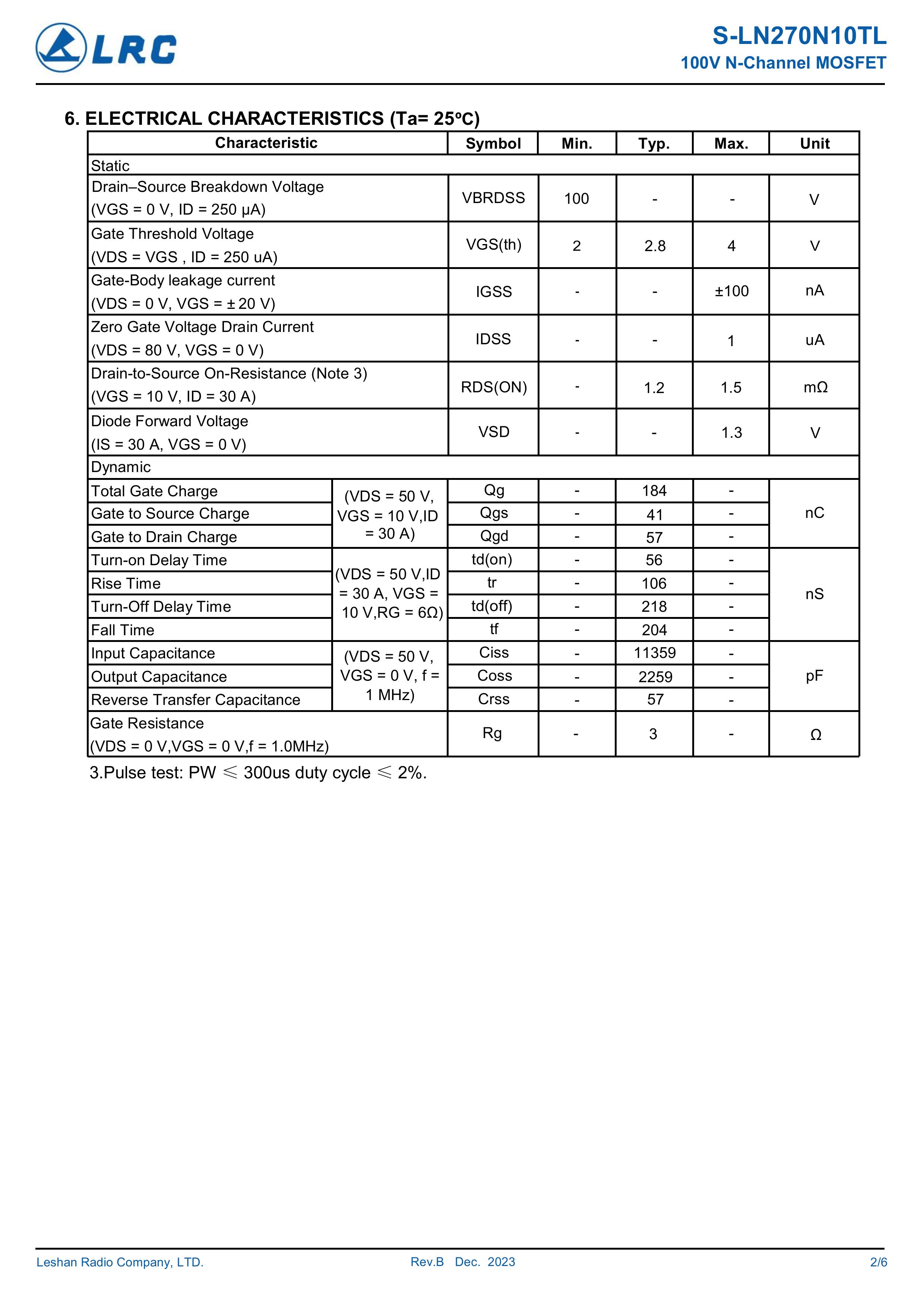 LRC/乐山无线电 S-LN270N10TL/270N10TL 全新原厂原装车规级中低压高频分立功率器件电子开关场效应管,源极多路N型沟道场管100V、270A、1.2mΩ、N-Channel、贴片式车规级中低压MOSFET:S-LN270N10TL/270N10TL。Vds电压:100V;Id电流:270A;Rds(on)内阻:1.2mΩ;封装方式:TOLL-1L;最小包装数量:1500pcs/盘-编带。