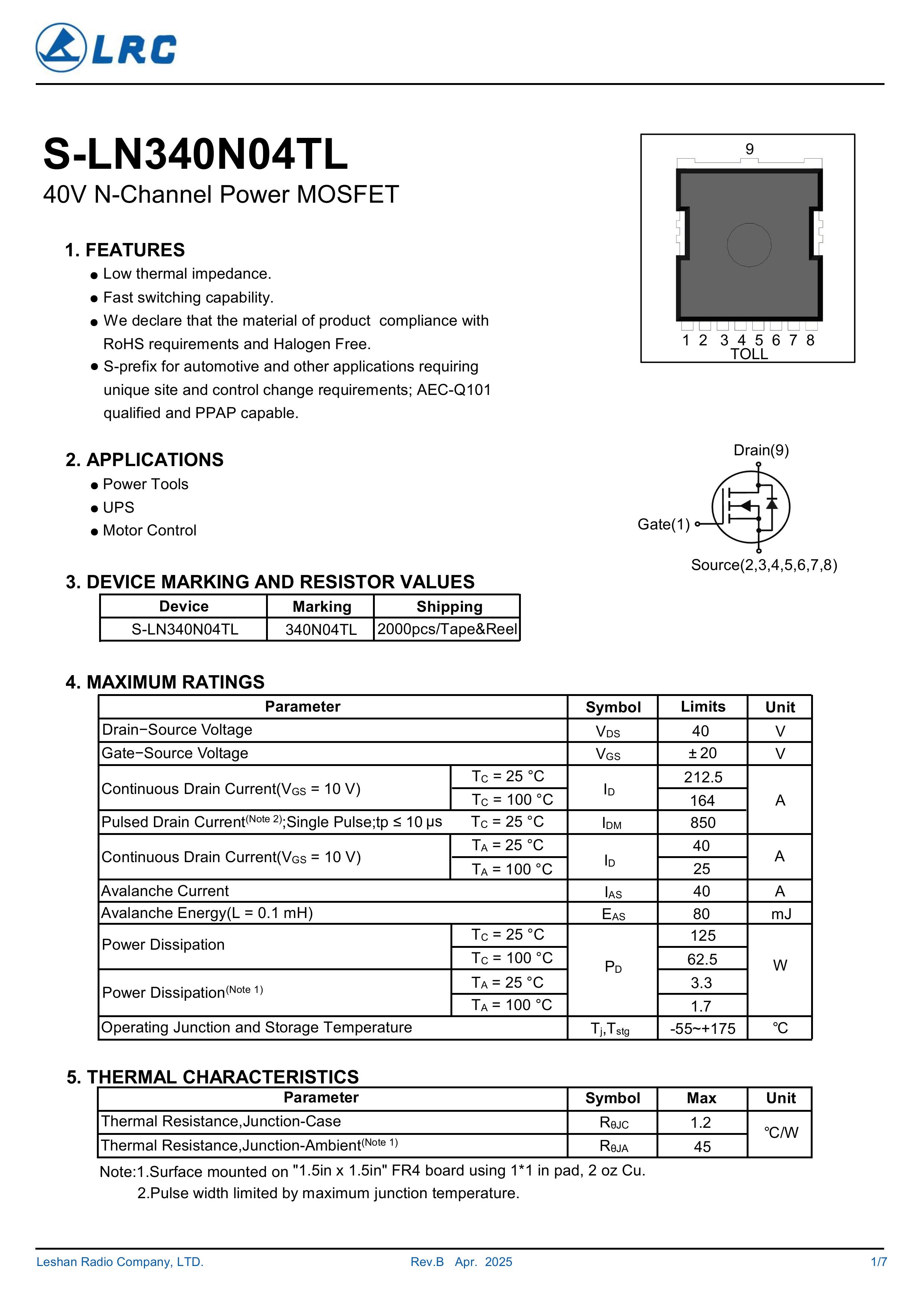 S-LN340N04TL/340N04TL 大芯片中低电压大电流低内阻低漏电的分立式功率整流晶体开关管。本品采用内置大尺寸芯片,源极7脚位支持多路输出贴片式封装,AEC-Q101认证,具有适应中低电压低内阻损耗高频高效恢复快等电气特性特点。通用于电源、小家电、锂电池、马达电机、电动工具、无人机、电器、适配器、充电器、逆变器、充电桩、特种电源、高频电源、风光储新能源、医疗设备、工业工控等产品电路作电子开关、控制、整流、放大、钳位、防反接、防逆回流等作用。