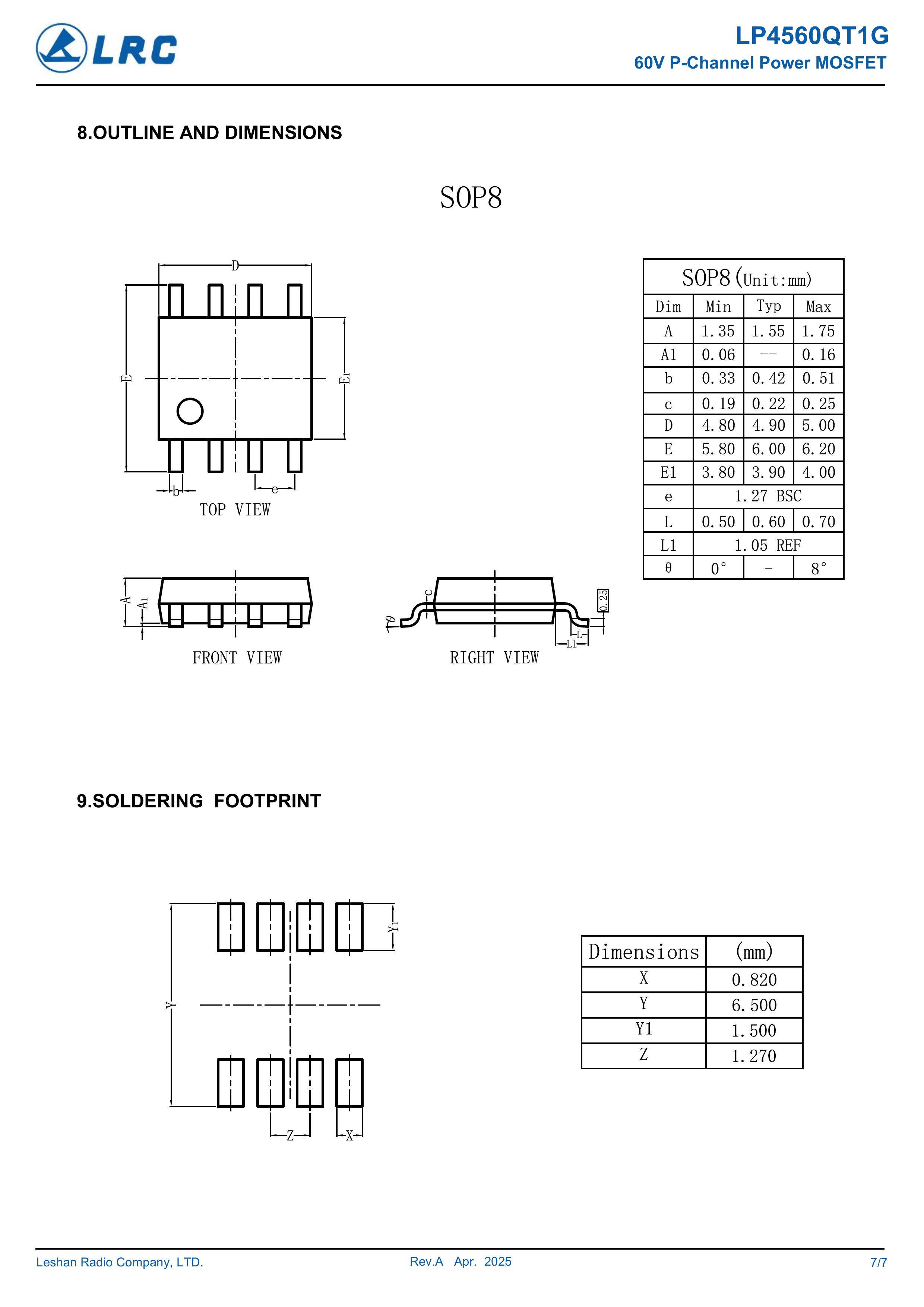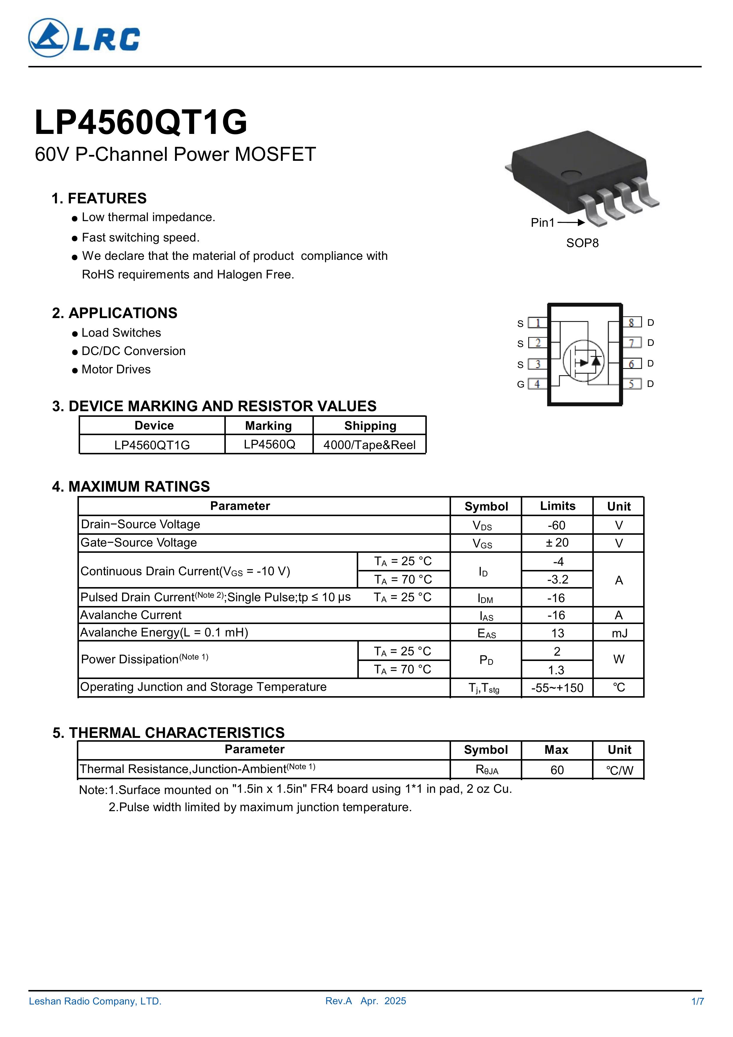 LP4560QT1G/LP4560Q 大芯片中低电压大电流低内阻低漏电的分立式功率整流晶体开关管。本品采用内置P型沟道大尺寸芯片,源极漏极多路输入输出脚位,,具有适应中低电压低内阻损耗高频高效恢复快等电气特性特点。通用于电源、小家电、锂电池、马达电机、电动工具、无人机、电器、适配器、充电器、逆变器、充电桩、特种电源、高频电源、风光储新能源、医疗设备、工业工控等产品电路作电子开关、控制、整流、放大、钳位、防反接、防逆回流等作用。