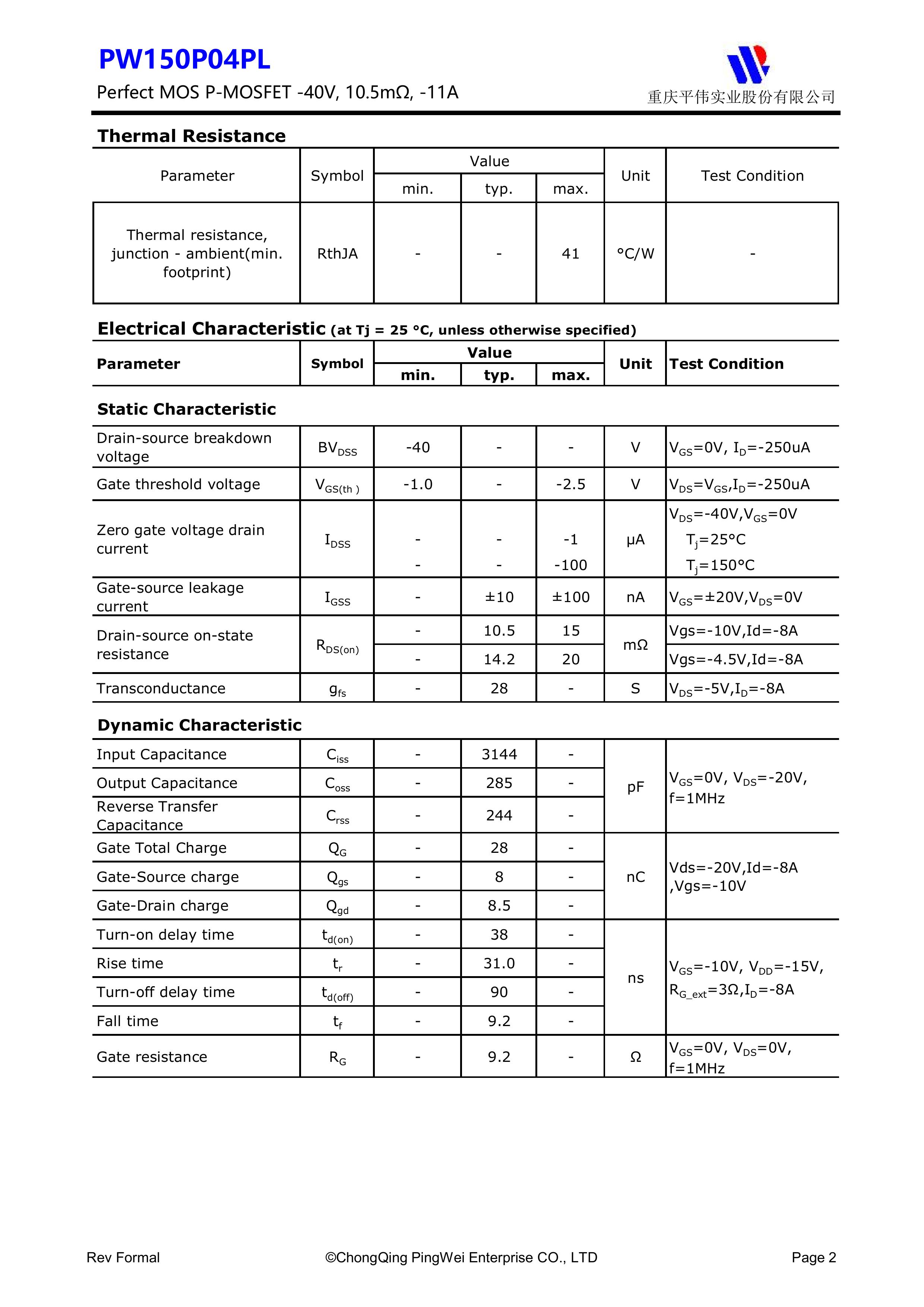 PY/平伟 PW150P04PL 全新原厂原装中低压高频分立式功率器件电子开关场效应管,P型沟道场效应管负电压-40V、-11A、10.5mΩ、P-Channel、贴片式中低压MOSFET: PW150P04PL。Vds电压:-40V;Id电流:-11A;Rds(on)内阻:10.5mΩ;封装方式:SOP-8;最小包装数量:4000pcs/盘-编带。