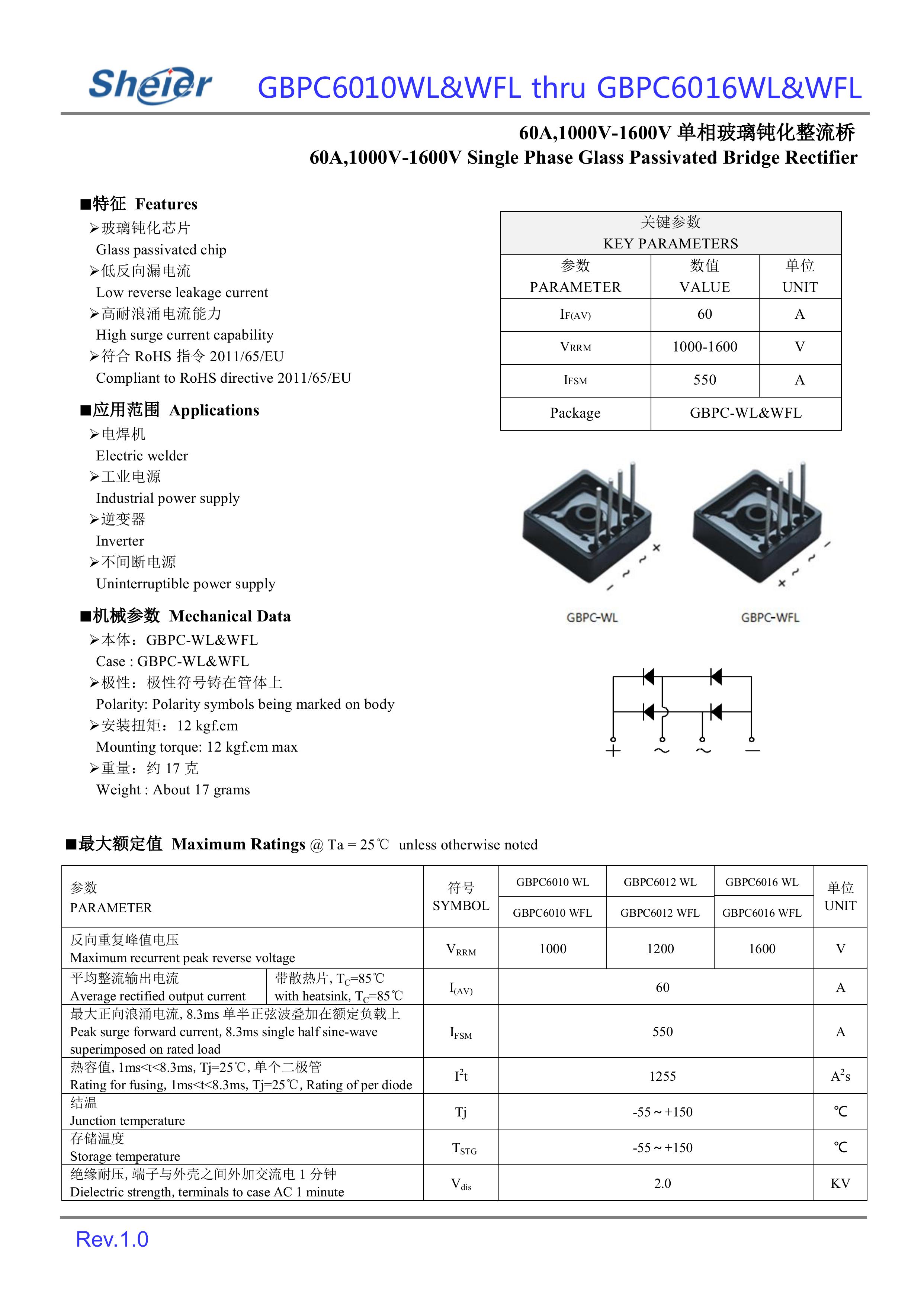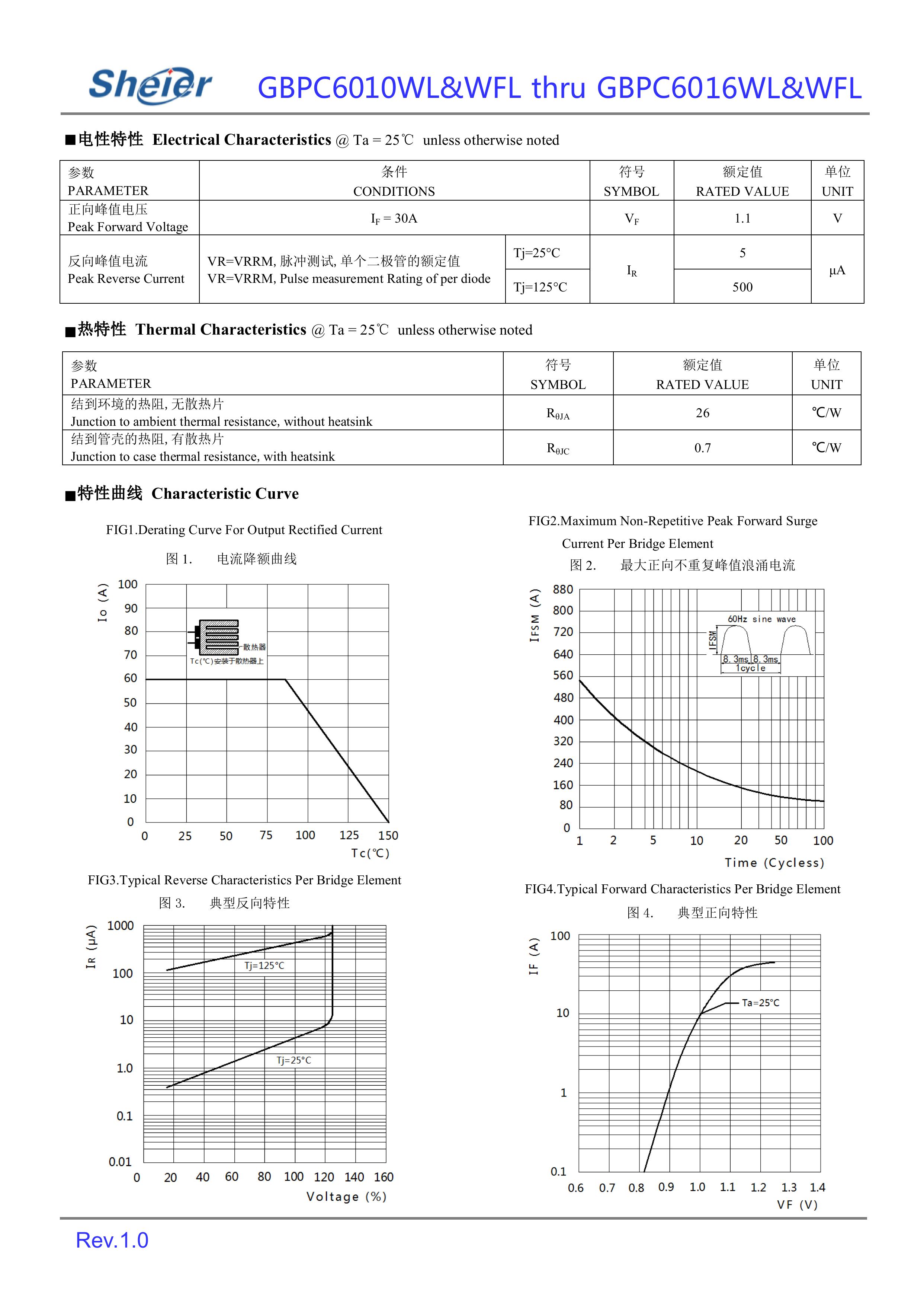 sheier/乐山希尔 GBPC6016WFL/GBPC6012WFL/GBPC6010WFL 全新原厂原装高压大电流分立式功率整流器件整流桥,1600V~600V、60A、单排针脚式方形桥堆:GBPC6016WFL/GBPC6012WFL/GBPC6010WFL。正向整流电流:60A;反向峰值电压:1600V~600V;;正向压降VF:1.2V;封装方式:ST-S针脚式;最小包装数量:100pcs/盒。