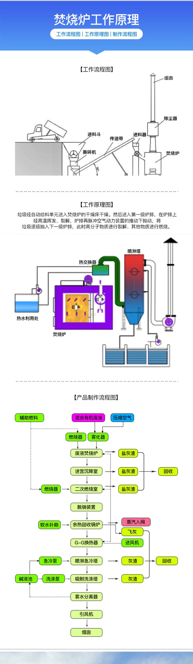 机械炉排焚烧炉工作原理:垃圾通过进料斗进入倾斜向下的炉排(炉排分为干燥区、燃烧区、燃尽区),由于炉排之间的交错运动,将垃圾向下方推动,使垃圾依次通过炉排上的各个区域(垃圾由一个区进入到另一区时,起到一个大翻身的作用),直至燃尽排出炉膛。燃烧空气从炉排下部进入并与垃圾混合;高温烟气通过锅炉的受热面产生热蒸汽,同时烟气也得到冷却,最后烟气经烟气处理装置处理后排出。特点:炉排的材质要求和加工精度要求高,要求炉排与炉排之间的接触面相当光滑、排与排之间的间隙相当小。另外机械结构复杂,损坏率高,维护量大。炉排炉造价及维护费用高,使其在中国的推广应用困难重重。 流化床焚烧炉工作原理:炉体是由多孔分布板组成,在炉膛内加入大量的石英砂,将石英砂加热到600℃以上,并在炉底鼓入200℃以上的热风,使热砂沸腾起来,再投入垃圾。垃圾同热砂一起沸腾,垃圾很快被干燥、着火、燃烧。未燃尽的垃圾比重较轻,继续沸腾燃烧,燃尽的垃圾比重较大,落到炉底,经过水冷后,用分选设备将粗渣、细渣送到厂外,少量的中等炉渣和石英砂通过提升设备送回到炉中继续使用。特点:流化床燃烧充分,炉内燃烧控制较好,但烟气中灰尘量大,操作复杂,运行费用较高,对燃料粒度均匀性要求较高,需大功率的破碎装置,石英砂对设备磨损严重,设备维护量大。回转式焚烧炉工作原理:回转式焚烧炉是用冷却水管或耐火材料沿炉体排列,炉体水平放置并略为倾斜。通过炉身的不停运转,使炉体内的垃圾充分燃烧,同时向炉体倾斜的方向移动,直至燃尽并排出炉体。特点:设备利用率高,灰渣中含碳量低,过剩空气量低,有害气体排放量低。但燃烧不易控制,垃圾热值低时燃烧困难。