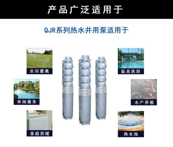 QJ,QJT 系列产品.是深井提水的重要设备.使用时整个机组潜入水中工作.把地下水提取到地表,是生活用水.矿山抢险.工业冷却.农田灌溉.海水提升.轮船调载.还可用于喷泉景观.热水潜水泵用于温泉洗浴.居民小区利用地热采暖时可作为地热循环泵等,用途十分广泛.