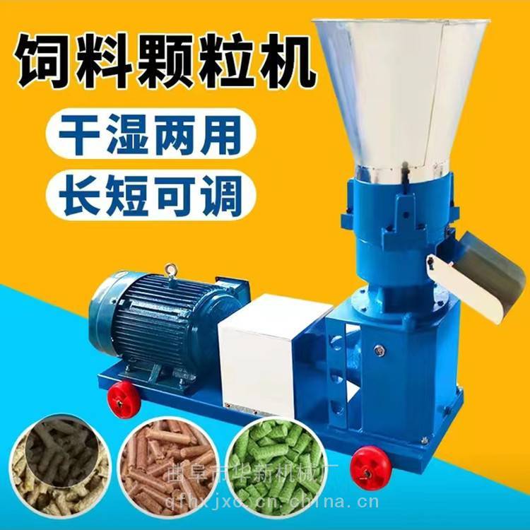 ?本产品采用模板、压辊采用优质合金钢经特殊处理,主轴及平模在摩擦力作用下,带动压辊自转,压辊与模板产生高温使淀粉熟化,蛋白质变性凝固,在压辊挤压下从模孔中排出,颗粒经甩料盘送出机外,通过调节切刀角度可控制颗粒长短,?本机器还实现了不用三角带带动,机器直接和电机连接避免了皮带打滑死机的效果!华新颗粒机主要适用于中、小规模养殖专业户等加工制作各种畜禽及水产颗粒饲料,可降低养殖成本。可用于养兔,鸡,鸭,鹅,鱼,猪,水产品等。