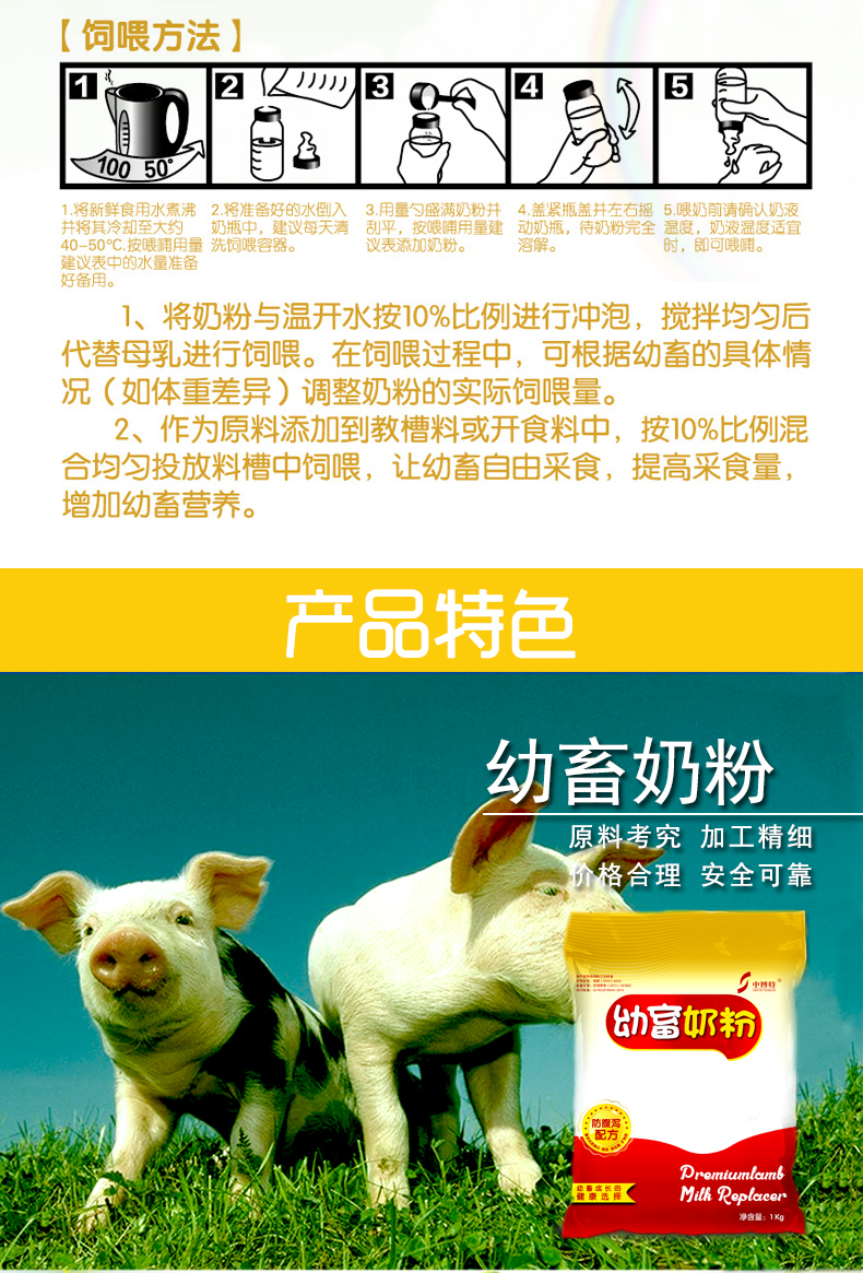 1、全乳蛋白、全乳脂肪、成分更接近于母乳,味道纯正、自然,保证幼畜爱喝,不添加任何工业香味剂。