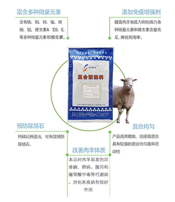 1、补充肉羊所需氨基酸、维生素和常量、微量矿物元素,以及肉羊瘤胃微生物营养调控剂、离子平衡剂、尿酶抑制剂、保健促长剂、高效驱虫药物等,促进肉羊健康,获得最佳生产效益;