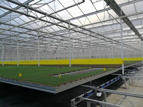 物流移动苗床在种植区内部是沿着圆管导轨移动的。苗床底部的滚轮由两条及一个底盘组成。苗床的底部有四组滚轮。苗床可以在导轨上移动。苗床平行的圆形钢管支撑。种植区被苗床移动线分割成若干区域,苗床就放置在每个区域内。当有新的苗床被推送到导轨上的时候,将推动之前放置的苗床,苗床之间可以互相推动。种植区导轨由规格为48x2.5mm的热镀锌钢管连接在一起,由导轨支架支撑。导轨支架通过膨胀螺栓固定在混凝土地面上,导轨的高度可以上下调节。苗床的横向移动是由多组移动线轨道组成的。