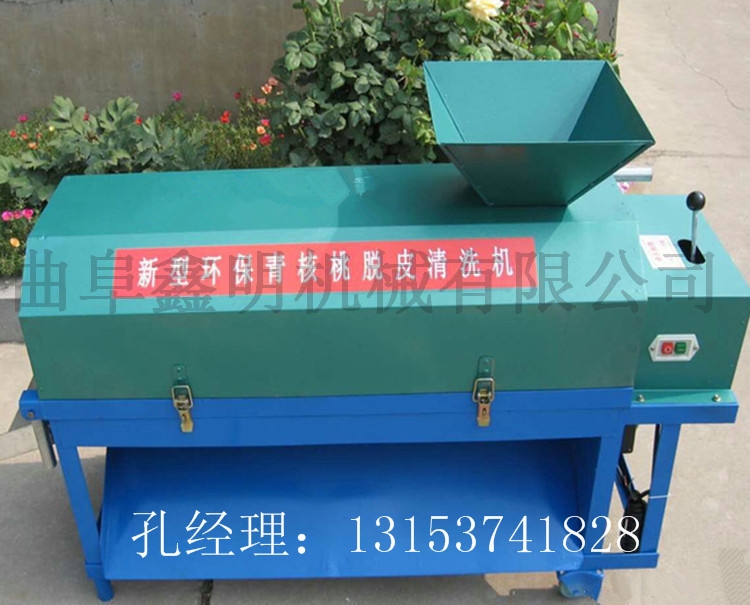 青核桃脱皮清洗机主要包括机架部分,喂给部分;上下防护罩板,传动罩安全机构;单相电动机、三角皮带传动、变速箱等动力、水泵部分;旋切滚筒、调节格栅、钢丝毛刷等脱皮部分组成。