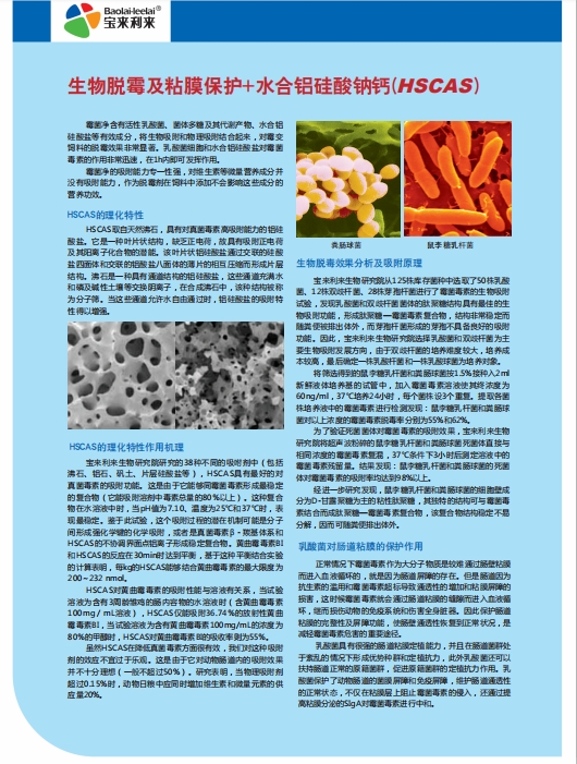 独创的将物理吸附与生物吸附完美统一,解决了单一物理脱霉只吸附,不降解的缺点,高效防霉解霉脱霉,黄曲霉毒素有效去除率超过95%,减少霉菌毒素毒害作用,延长储料存放时间,同时保护消化道粘膜,增强机体抗病能力;吸附粪便臭味,改善养殖环境。