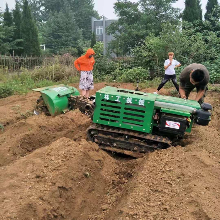 多功能 履带式开沟施肥机安装上不同的配件可以进行单独旋耕、回填、单独开沟、施肥、也可混合搭配使用。产品结实耐用,性能优越,操作方便.耐用:机身加厚,密,履带式行走,可进行原地转向。刀具都是加厚75号猛钢锻造,非常耐磨耐用,工作效率高.