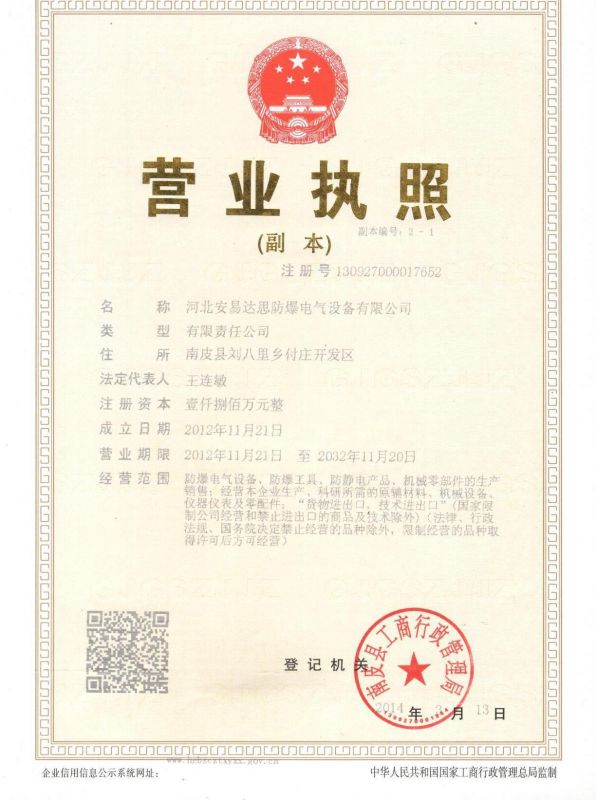 公司简介:河北安易达思防爆电气设备有限公司是渤海集团旗下的公司之一,专业生产防爆电气、防爆配电箱柜、防爆灯具、防爆空调、防静电产品、防爆工具,特种工具,不锈钢工具,平台量具,注册资金1800万元,是中石油、中石化入网单位,请您安心购买,放心使用。