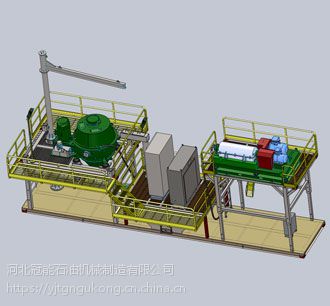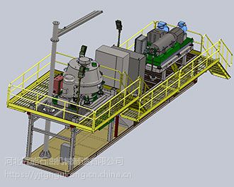 工作时候,将钻屑甩干机支架升高到处,能够满足钻屑甩干机的钻屑排放。离心机放于翘座的罐体上, 排出的液相部分直接流入到底部的收集罐中,需要输送钻井液时候,可以通过一台输送泵进行输送或将 此罐体与相近高度的罐体进行连接。