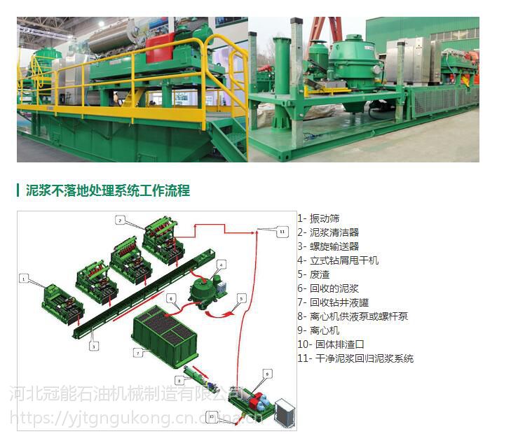 工作流程说明如下:钻机过来的泥浆通过高架管汇进入振动筛(1)、清洁器(2),经过(1)、(2) 处理排放的钻屑通过螺旋输送器(3)输送至立式甩干机处理(4)。立式甩干机处理完的固体通过废渣(5) 排除,回收到的钻井泥浆(6)进入钻井液泥浆罐体(7),离心机供液泵或螺杆泵(8)抽取含有细固 颗粒的回收泥浆,供给离心机(9 )处理,固体部分通过固体排渣口(10)排除,处理完成的钻井液通 过干净泥浆回归泥浆系统(11)。