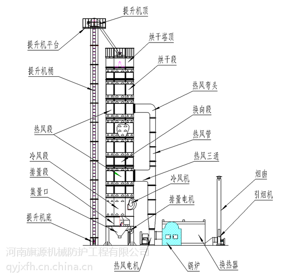 它由卸粮、提升、清理、输送、烘前仓、烘干塔、烘后仓、热源、电器及控制单元组成,可以露天安装使用,也可以安装在厂房中使用。