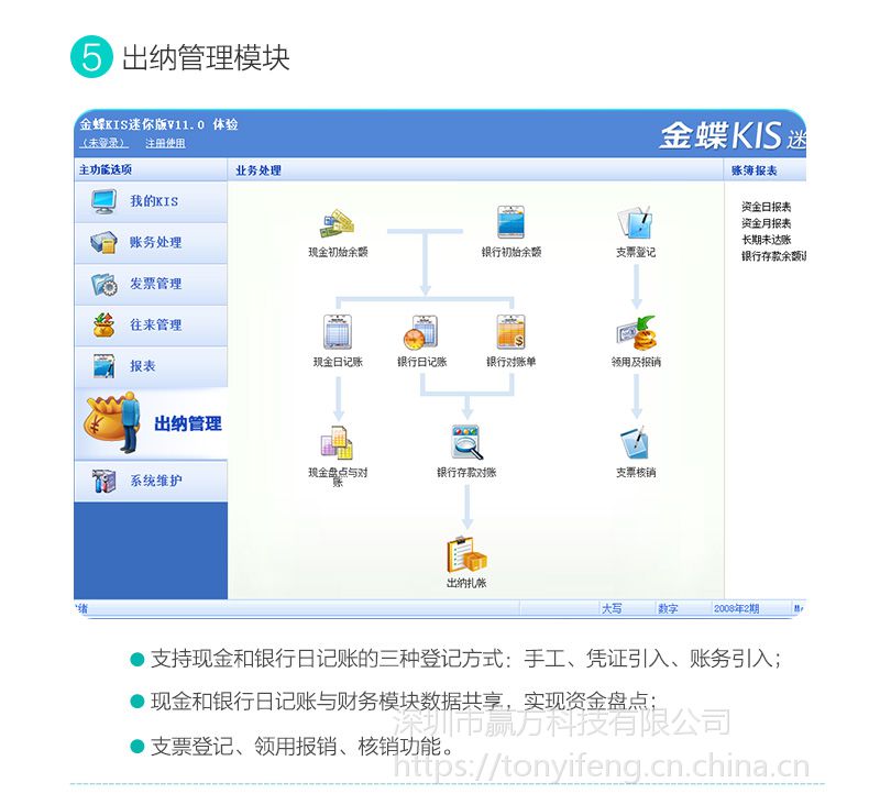 现金和银行日记账的日常管理,银行对账单自动对账。