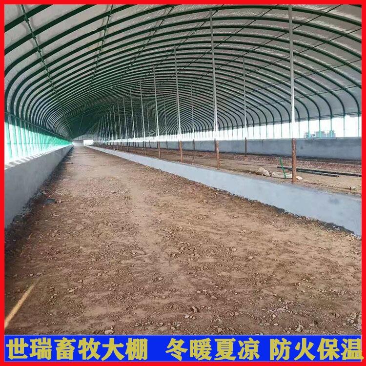 养牛大棚的布局与设计:肉牛养殖小区的布局、设计要求与规模化牛场近似,也应包括消毒池、兽医室、生产牛舍、隔离牛舍、饲料间、青贮池、氨化池、贮粪场、粪污处理设施、装牛台等设施,但生活区、生产区的划分不很明显,牛舍一般为单列式,每栋6-12间,为1-2户所有,1-2间为饲料室和宿舍,其余为牛舍。每间牛舍饲养3-5头,基础牛舍、产犊舍、犊牛培育舍、育成牛舍和育肥牛舍的划分不明显。青贮池和氨化池由各养牛户按饲养规模集资建设,一般二池合一,这样既可节约投资,又可提高设备的利用率。青贮池和氨化池一般位于牛舍的两侧,便于取料。